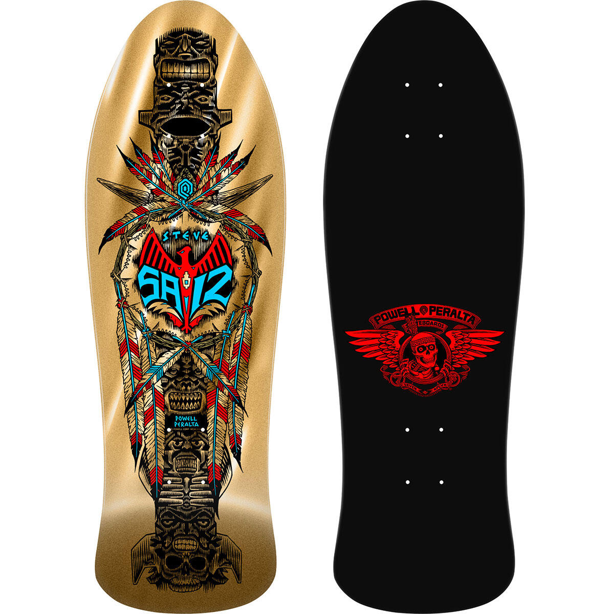 In the late 1980's, Powell Peralta had an established vert team that was maxed out with the likes of Tony Hawk, Steve Caballero, Mike McGill and Lance Mountain. In an effort to expand the companies pro roster to include the growing "Street-Style" market, they began adding new "street" pros. After Tommy Guerrero it was Mike Vallely, then Ray Barbee. The fourth Powell-Peralta Street pro to receive a deck model was Long Beach local, Steve Saiz. His Native American "totem pole" graphic was the second illustrated by newly acquired artist Sean Cliver in 1989. Saiz continued to skate for Powell-Peralta into the early 1990's until his knee unfortunately gave out.