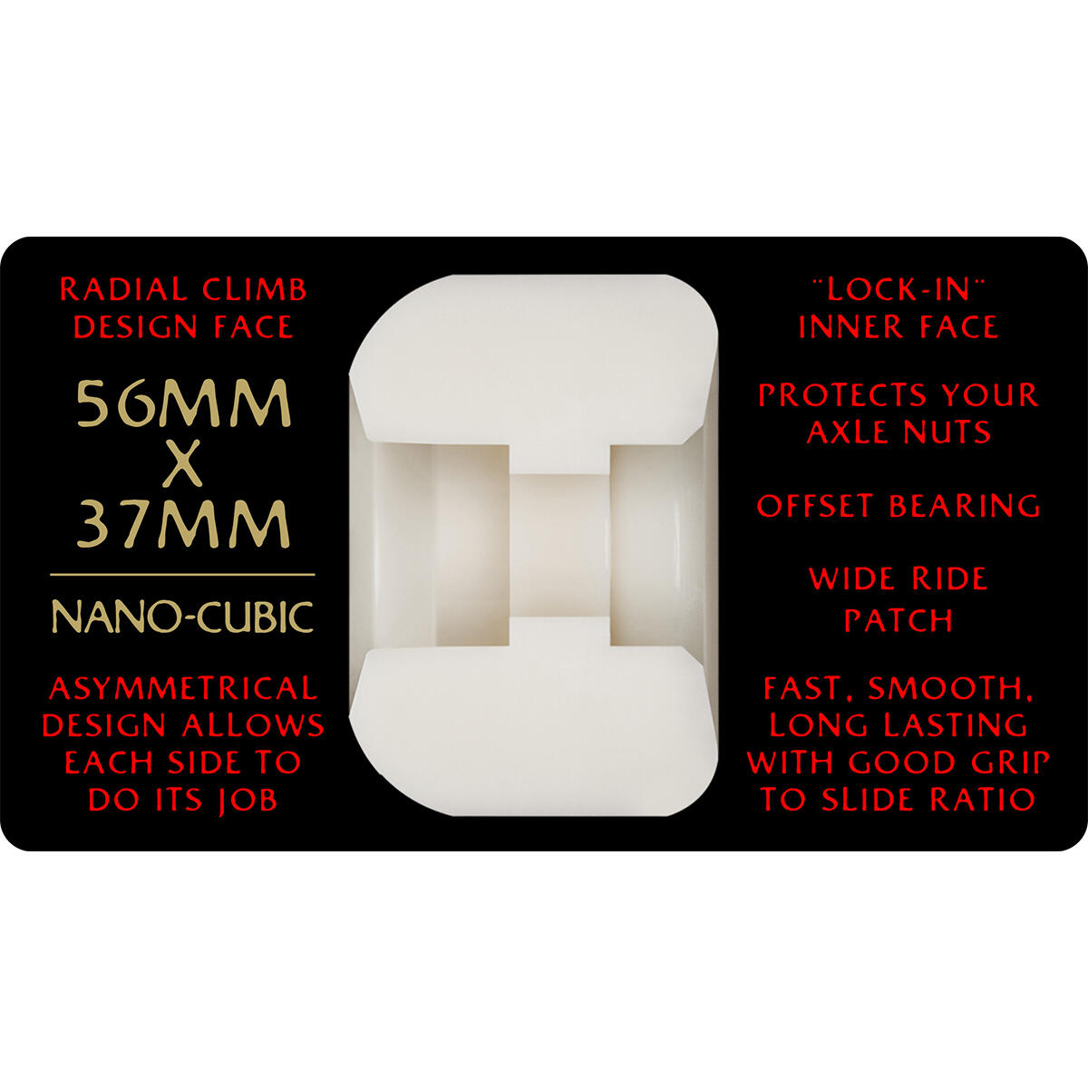 The Nano Cubic's offset design allows it to have the perfect shape for both inner and outer edges to skate a wider range of obstacles. Nano Cubics are smaller, lighter, and offset, so their large outer edge rolls up curbs, walls, and over cracks, and it covers your axle and nuts. The inner edge locks onto rails but releases when you need to.