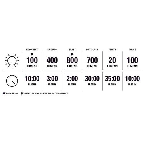 With eight LEDs, this light is engineered for maximum efficiency and runtime, providing the best beam pattern for optimal visibility in even the most challenging conditions. Six different output modes, including Daytime Flash, 800 lumens max output, and a 35-hour runtime on femto mode, ensure you’re prepared for any circumstance.
