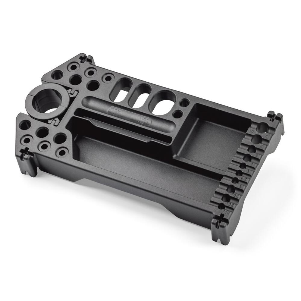 Dedicated spaces keep your T-Handle wrenches, pliers, thru-axles and more, perfectly organized while large, deep recessed bays hold fluid bottles, components, and additional tools. Plus, a smartphone holder keeps your device visible and accessible for easy viewing of service procedure videos. The magnetic parts tray prevents small fasteners from being lost and accessory hooks act like extra hands to hold wheels, handlebars, forks, wash hose nozzles, and more.