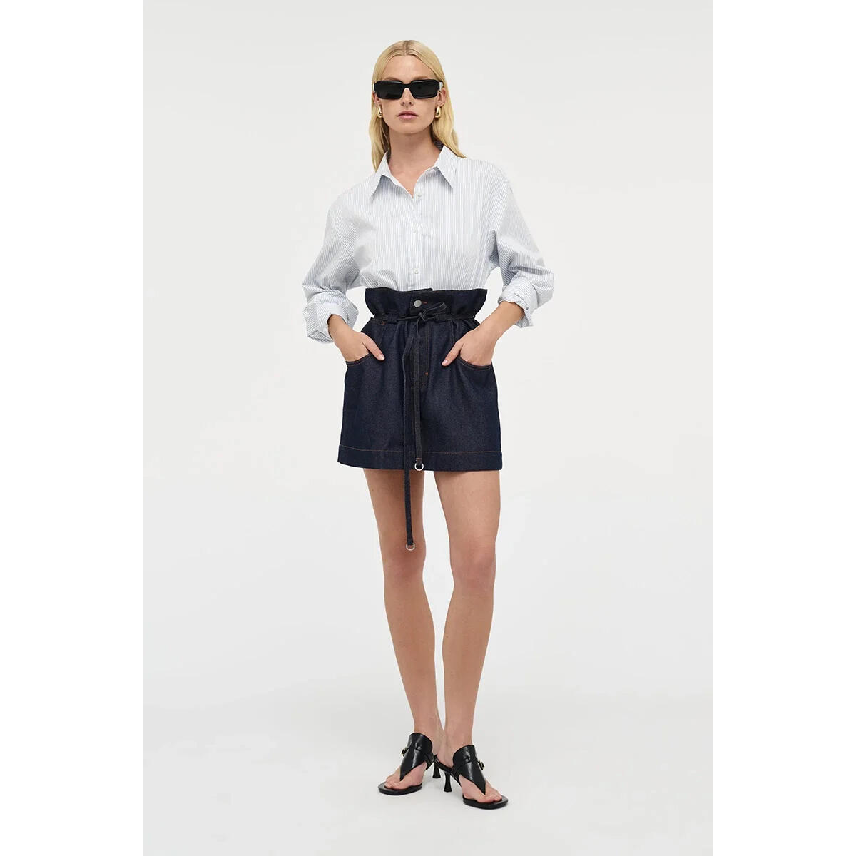 Designed with a deep waistband and self-fabric belt, allowing for a low-slung, paperbag-style fit
