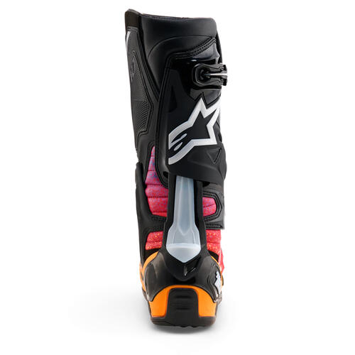 • Built into the Tech 10’s unique and lightweight single-piece co-injected foot chassis is the patented Dynamic Heel Compression Protector (DHCP), an innovative safety feature which includes a fully integrated collapsible heel area with expanded poly-foam to absorb high impact energies during a crash. DCHP features a directional impact protection system which significantly reduces the effect of excessive, potentially injury-causing, energy being transferred to the ankle and lower leg. DHCP has been used by Alpinestars’ athletes in the demanding environments of professional Supercross and Motocross.