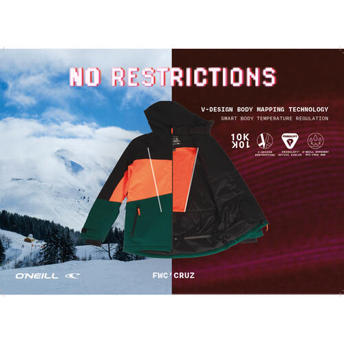 The Cruz Block Snow Jacket is made to push limits and stand out. 10K waterproofing and 10K breathability in combination with a PFC-free, water-repellent coating lock out moisture without causing overheating. Featuring cutting-edge O'Neill V-Design Body Mapping technology—a smart temperature-regulation system with integrated PrimaLoft® Active Evolve panels—the jacket delivers dynamic warmth without bulk. Performance-driven features include armpit venting for instant airflow, a storm placket and snow gaiter for total weather protection, and a jacket-pants connector system to seal out the elements. A bold colour-block design and vibrant zipper complete this head-turning snow jacket that’s guaranteed to make a statement on and off the slopes. Plus, it includes an easy-to-use repair patch, extending the lifespan of your gear so you can enjoy your playground longer. Designed for both skiers and snowboarders.