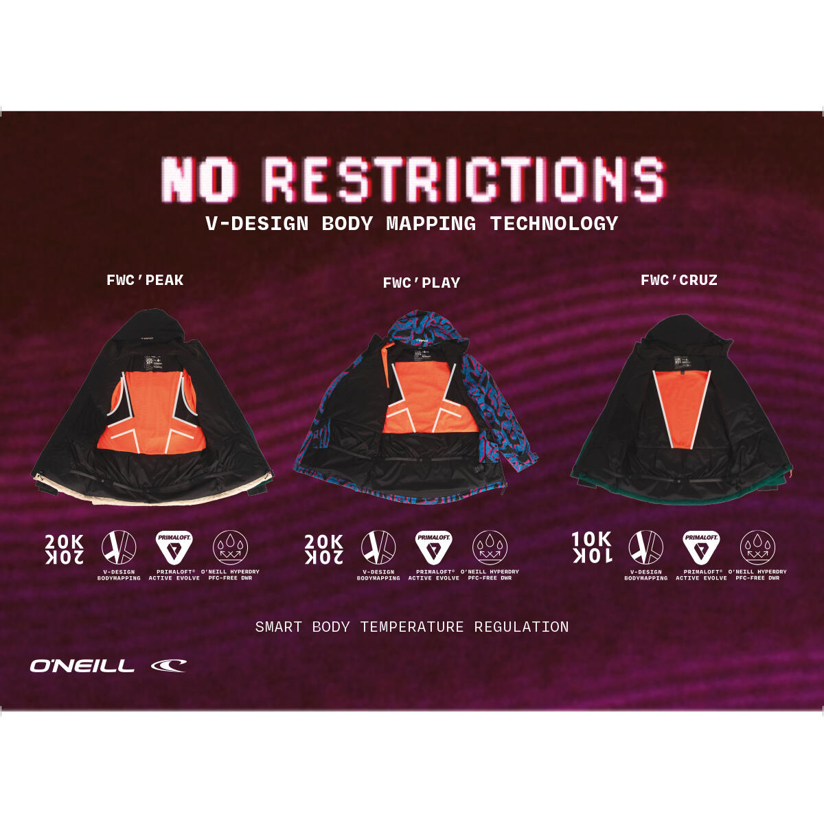 The Cruz Snow Jacket delivers 10K waterproofing and 10K breathability in combination with a PFC-free, water-repellent coating, keeping you dry, warm, and ready for any conditions. Featuring cutting-edge O'Neill V-Design Body Mapping technology—a smart temperature-regulation system with integrated PrimaLoft® Active Evolve panels—the jacket delivers dynamic warmth without bulk. Armpit venting offers instant airflow when the intensity rises, and a storm placket, snow gaiter, and jacket-pants connector system work together to keep the elements out. The adjustable fixed hood and LYCRA® wrist gaiters seal in warmth, giving you full coverage, whatever the weather. Multiple storage compartments, including a handy slanted chest pocket, make this jacket an essential for long days in the snow. Plus, it includes an easy-to-use repair patch, extending the lifespan of your gear so you can enjoy your playground longer. Designed for both skiers and snowboarders.