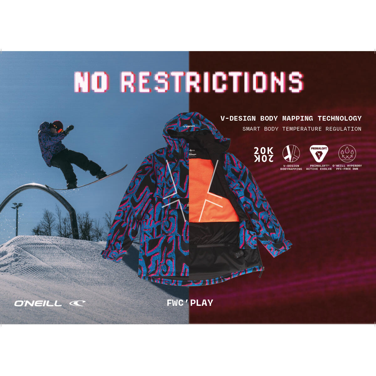 Landing a new trick or ripping fresh powder keeps you coming back for more with the FWC'Play Asymmetric Snow Jacket. Featuring cutting-edge O'Neill V-Design Body Mapping technology—a smart temperature-regulation system with integrated PrimaLoft® Active Evolve panels and REPREVE® recycled polyester insulation—the oversized jacket delivers dynamic warmth without bulk. Made with 20K waterproofing and 20K breathability in combination with a PFC-free, durable water-repellent coating and critically taped seams for ultimate weather protection, the jacket is your best mate when it comes to most dynamic tricks in the park, in the streets, or on the slopes. Plus, it includes an easy-to-use repair patch, extending the lifespan of your gear so you can enjoy your playground longer. Designed for both skiers and snowboarders.
