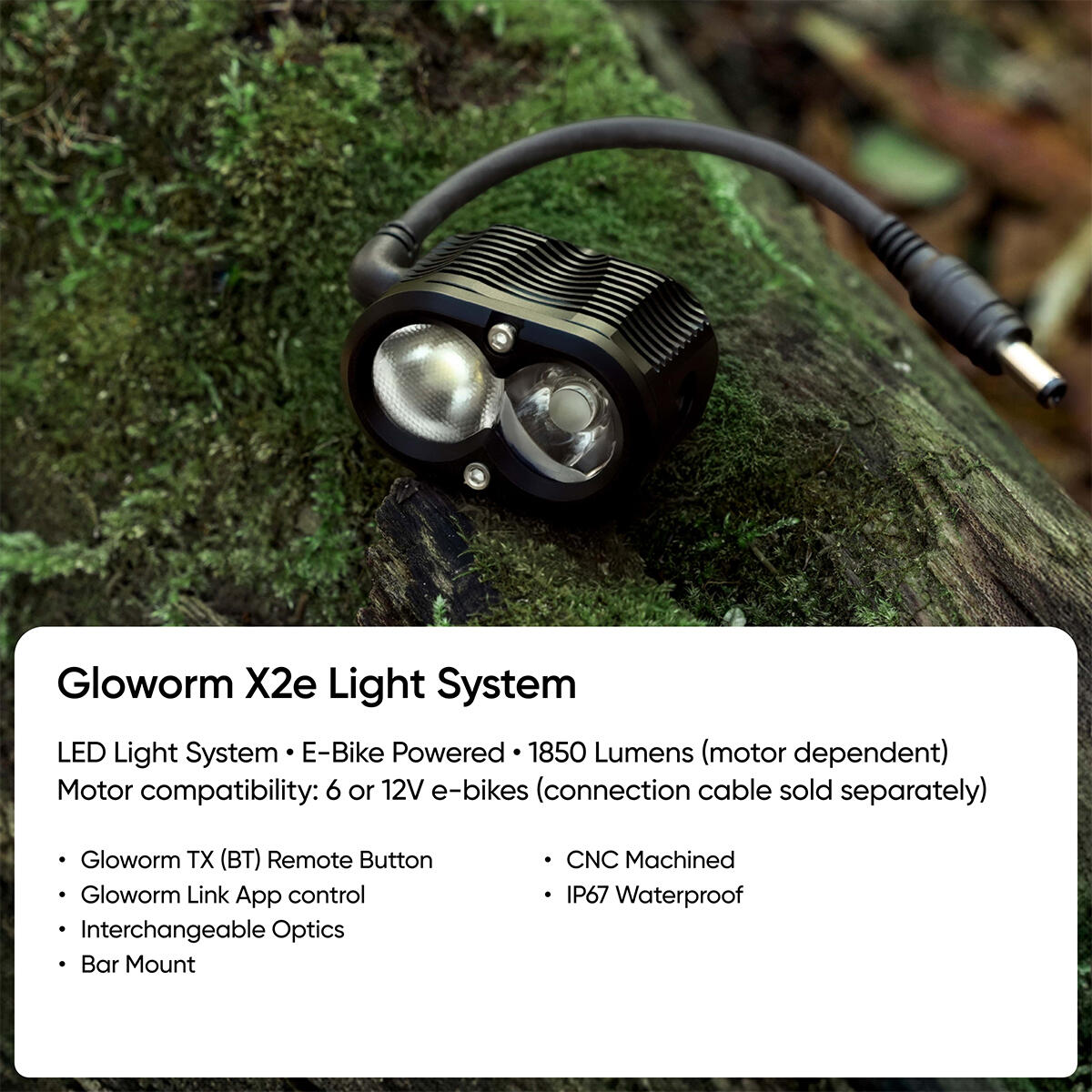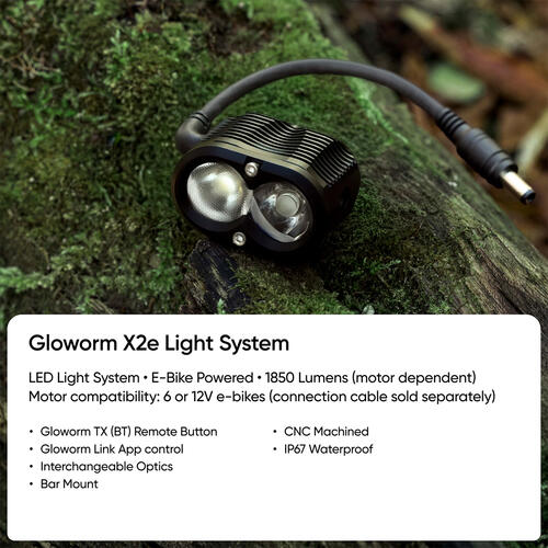 The Gloworm X2e Light System (G2.1) is built specifically for e-bikes with 6V or 12V motors, delivering up to 1850 lumens powered directly by your e-bike system. It features intelligent input detection, automatically adapting to your bike’s voltage for optimal performance. Drawing power directly from your e-bike’s battery means unlimited runtime and one less device to charge. Wireless remote control and mobile app customisation put complete control at your fingertips. Night riding on your e-bike will never be the same.