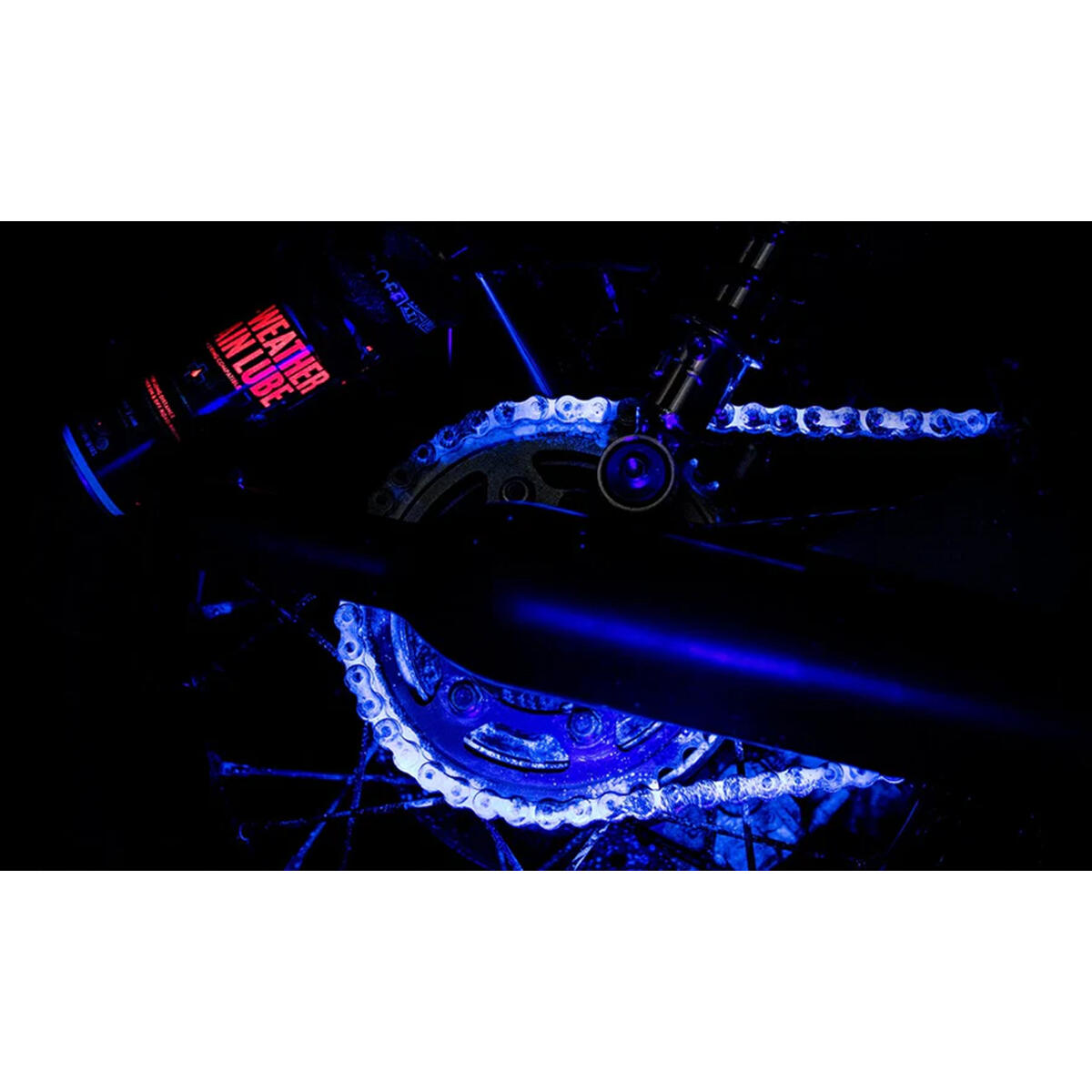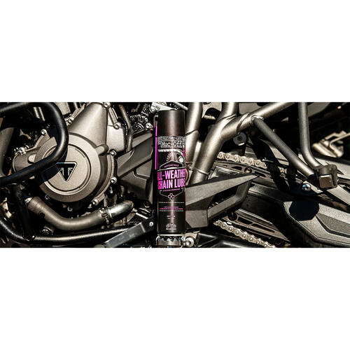 After years of research and development, we identified that there were some big differences with what riders want and need from a chain lubricant. After all, Racing motorcycles, touring motorcycles and off-road machines are all going to have different chain lube requirements. Muc-Off All-Weather Chain Lube is the first of its kind and is set to revolutionise chain efficiency and performance for all motorcycles covering longer distances and is ideal for tourers or commuters as you can go far longer between reapplication intervals. Our unique water repellent, ceramic, non-fling formula penetrates deep into the chain link. This creates a durable protective coating which will guard your chain against corrosion and metal to metal wear, in all weather conditions. An added benefit to our unique formula is that it includes a UV Dye, which means you can accurately see the lubricants specific coverage when using a UV Torch. This also allows you to wipe away any overspray that may have otherwise gone undetected.