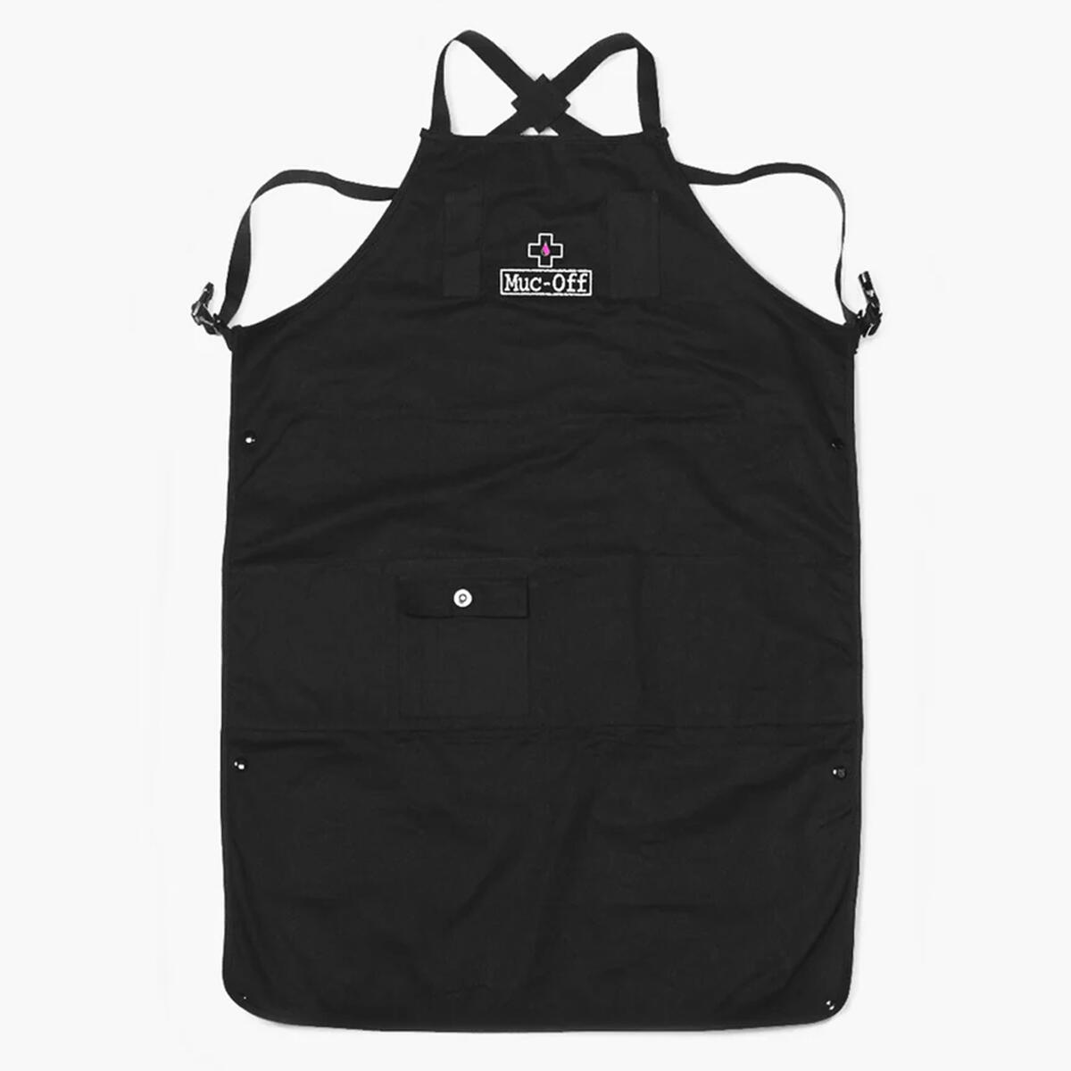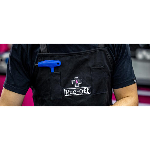 The Muc-Off Workshop Apron has straps and buttons for adjustable size and length that keep you from getting tangled and perfectly sized pockets that make sure your hands are always free when you need them.