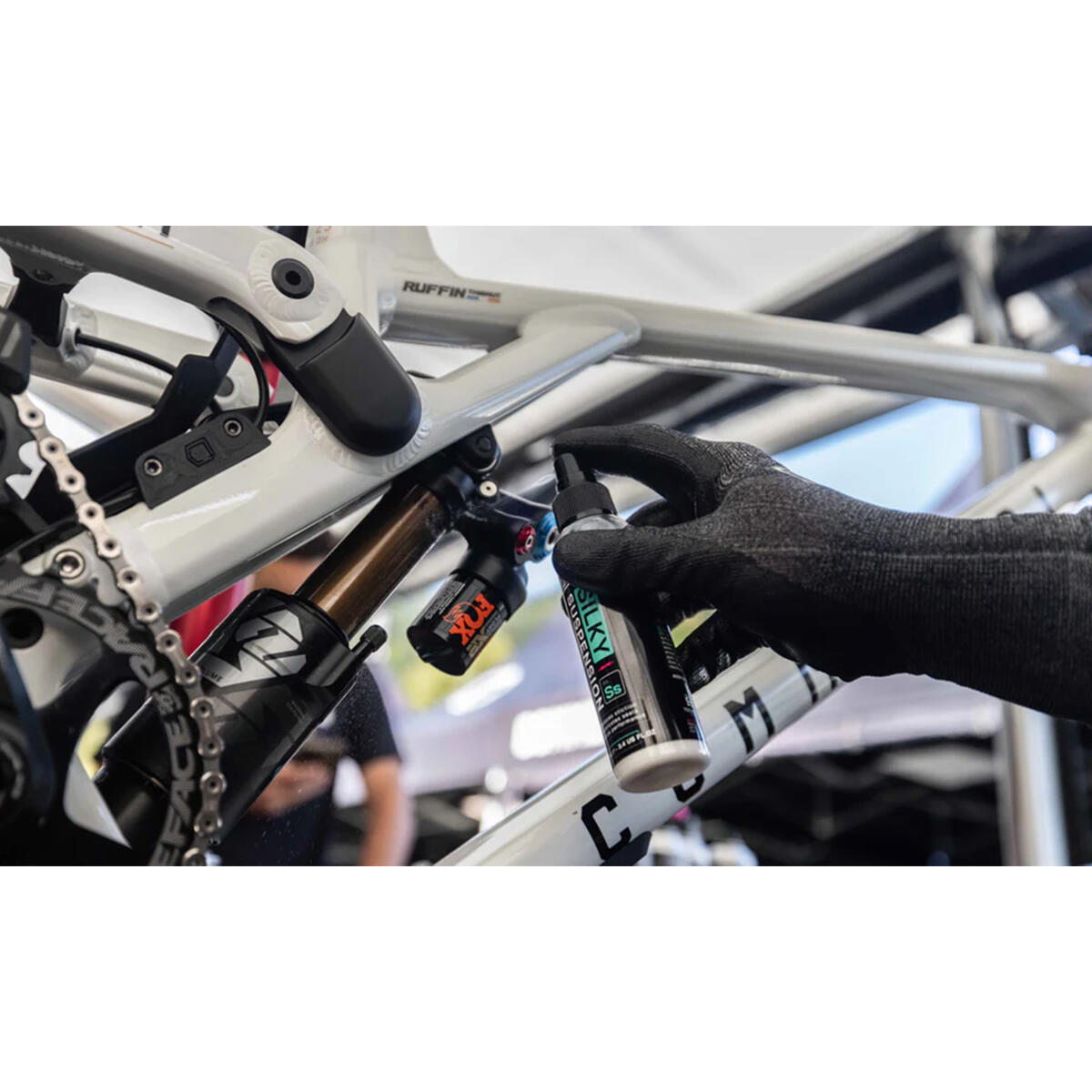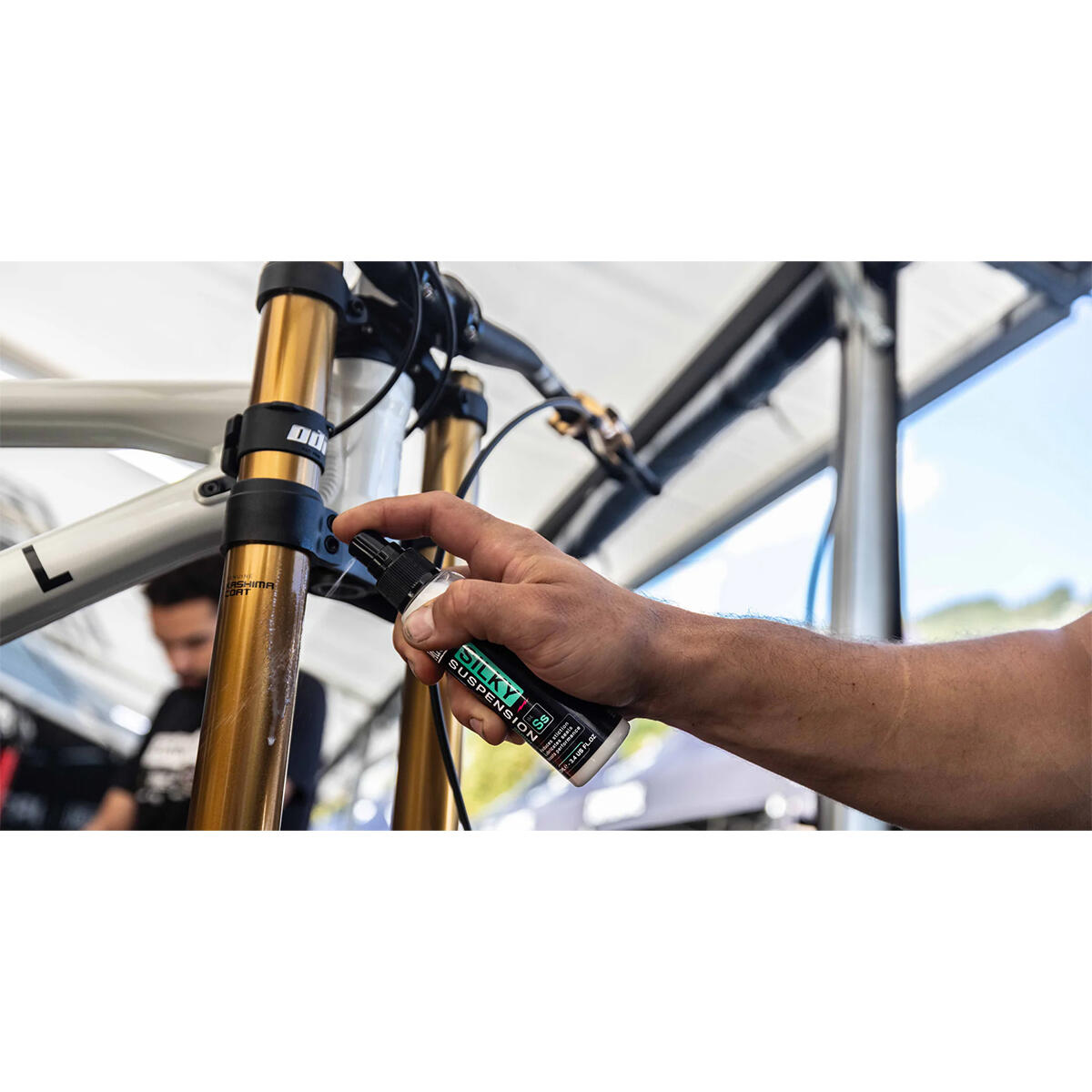 4. Shake bottle to activate formula, then spray a small amount directly onto shocks, stanchions, and/or dropper post