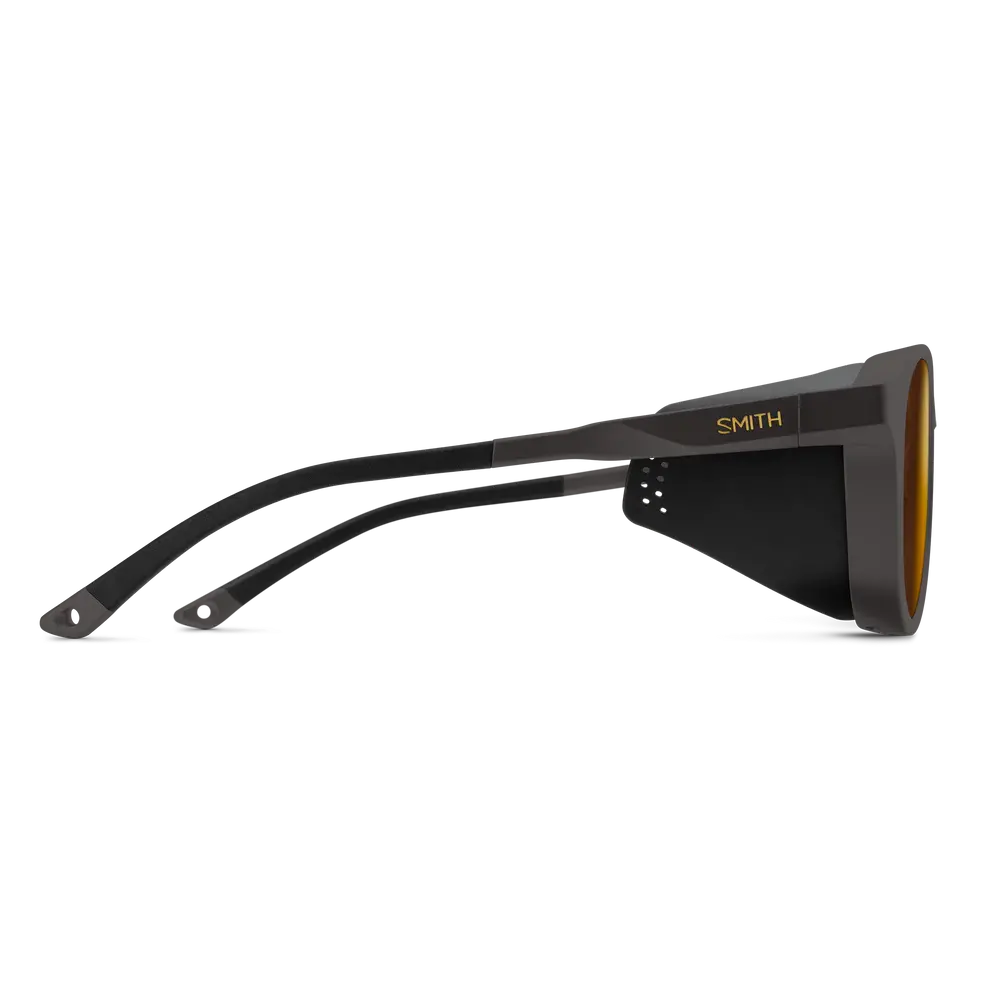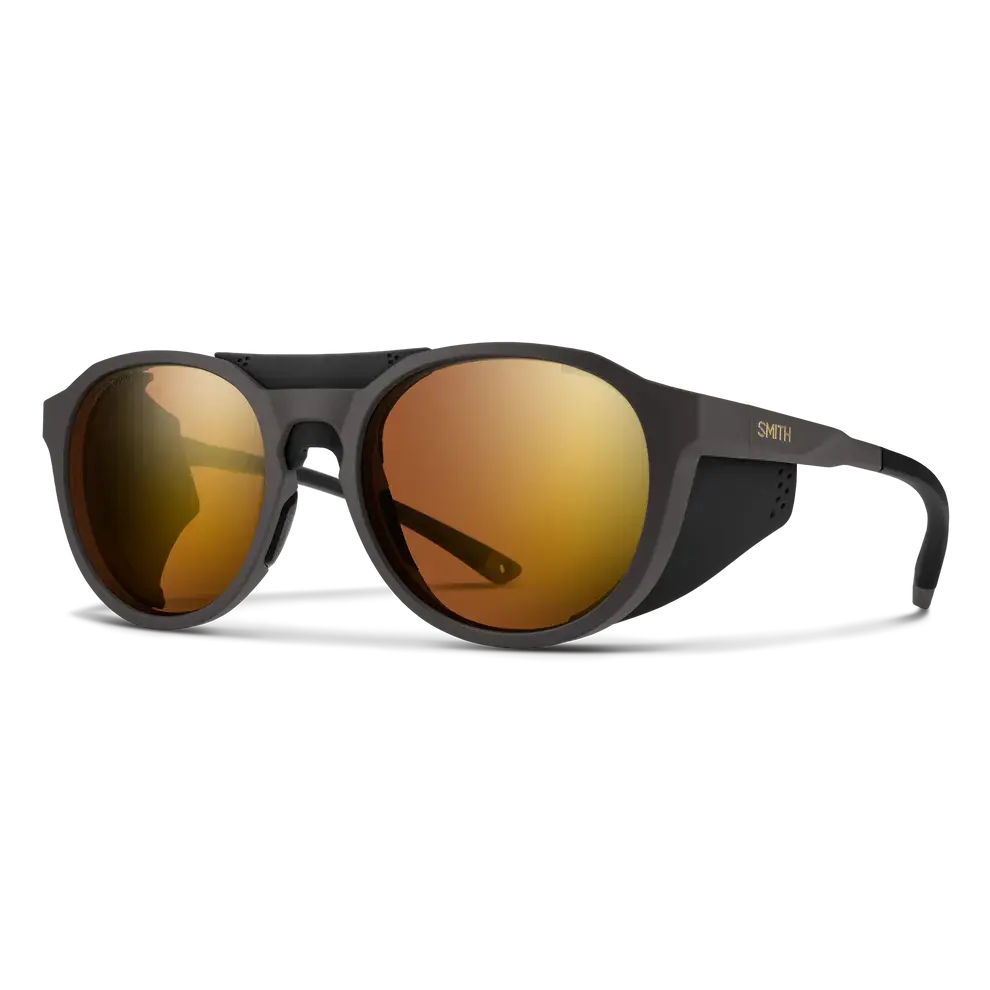 Where snow falls, you follow. On summit bids or high-speed descents, the Smith Venture sunglasses provide much-needed eye protection in alpine environments. They're our take on glacier glasses, with removable side shields that protect against light reflecting off snow, rock and ice. ChromaPop™, lens technology offers a terrain-boosting view of every wind drift and crevasse. Autolock hinges make for easy on and off when one of your hands is occupied with an ice axe or ski poles. And then there are the iconic round frames that look just as good glissading down a snowfield as relaxing post adventure.