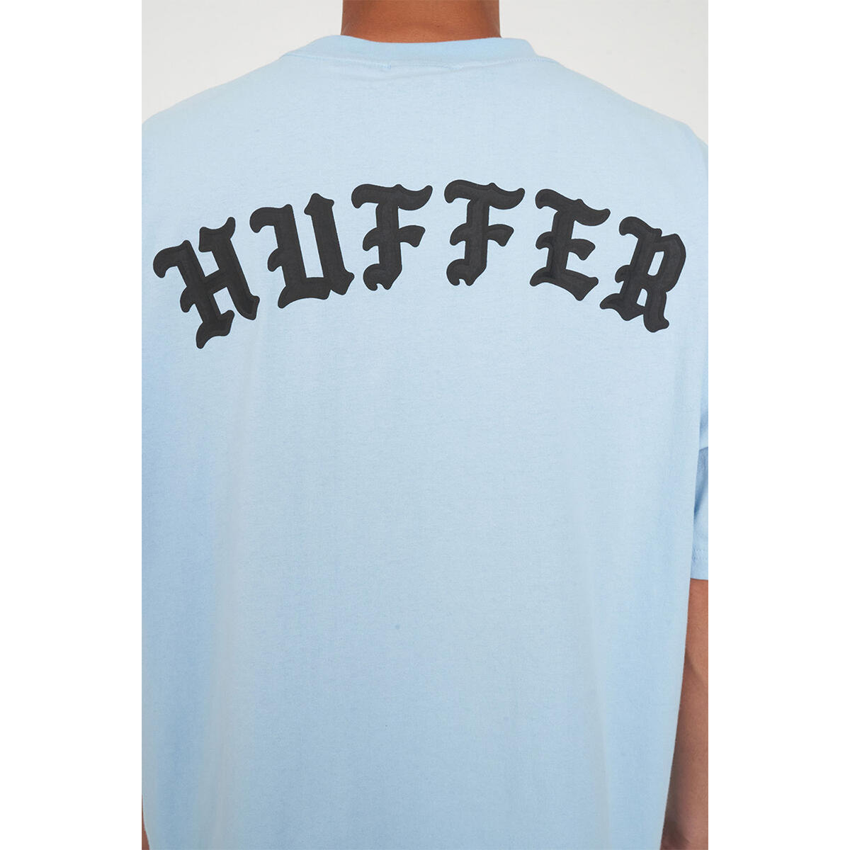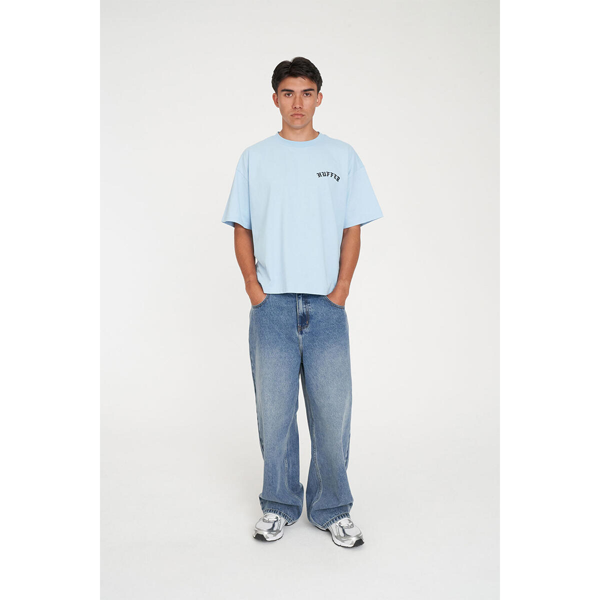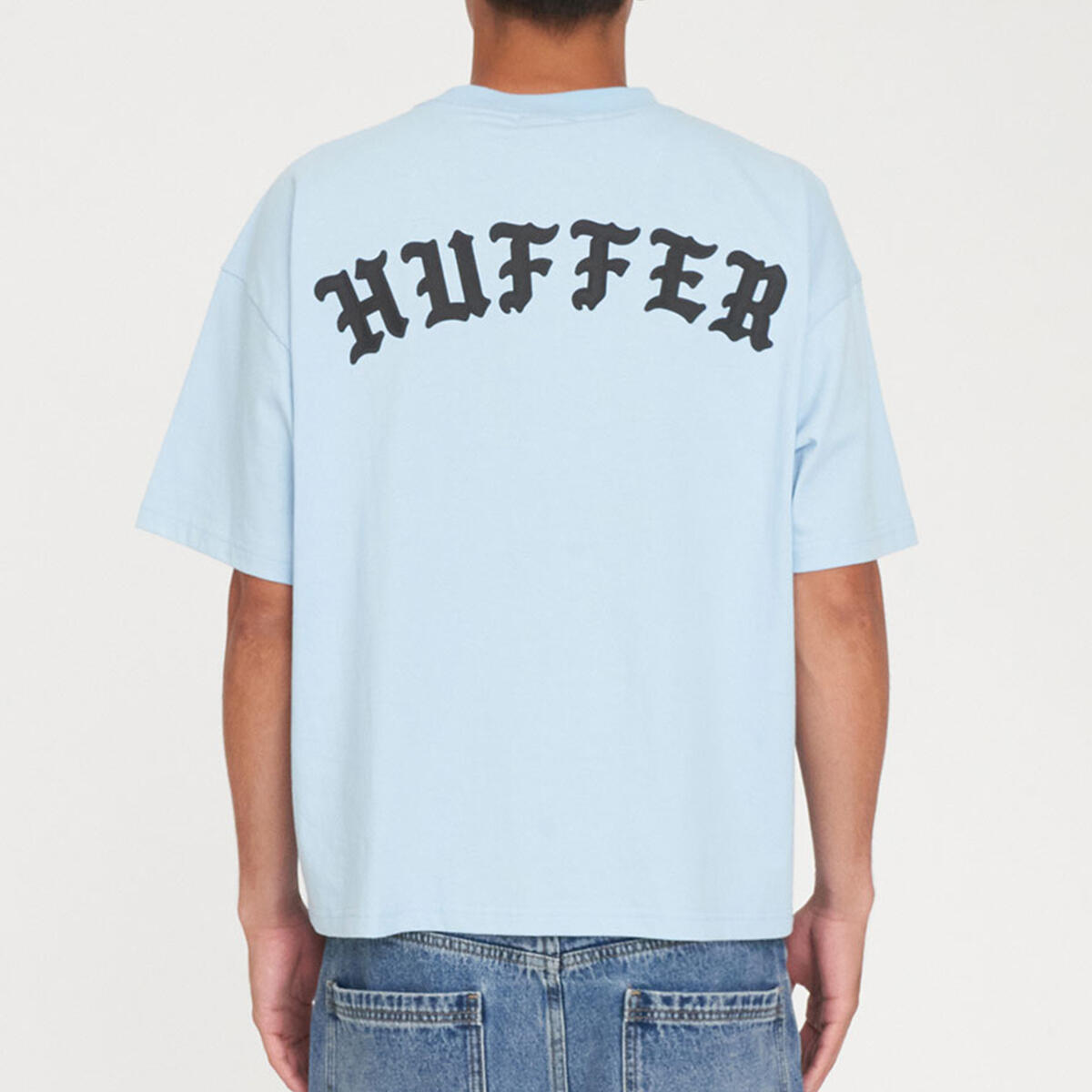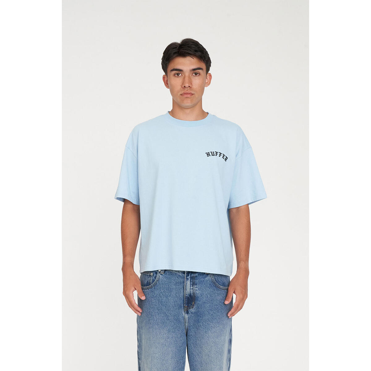 • What you need to know: 100% Cotton, 220gsm, 25mm Neck rib, Boxy cropped fit, Short sleeve, Huffer branded placement screenprint & puff print