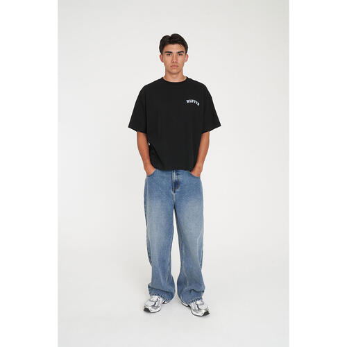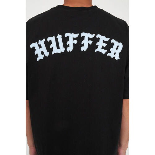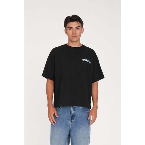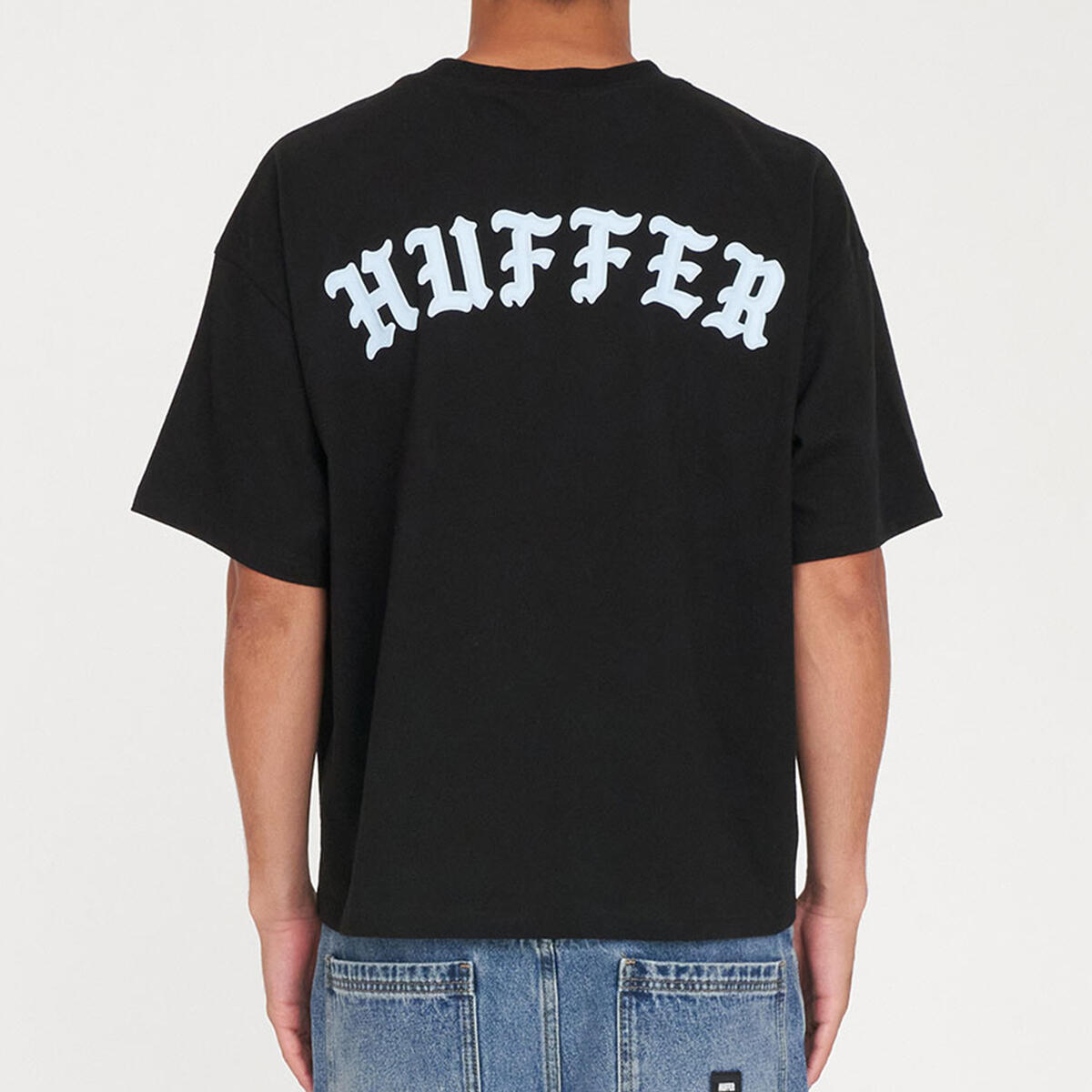 • What you need to know: 100% Cotton, 220gsm, 25mm Neck rib, Boxy cropped fit, Short sleeve, Huffer branded placement screenprint & puff print