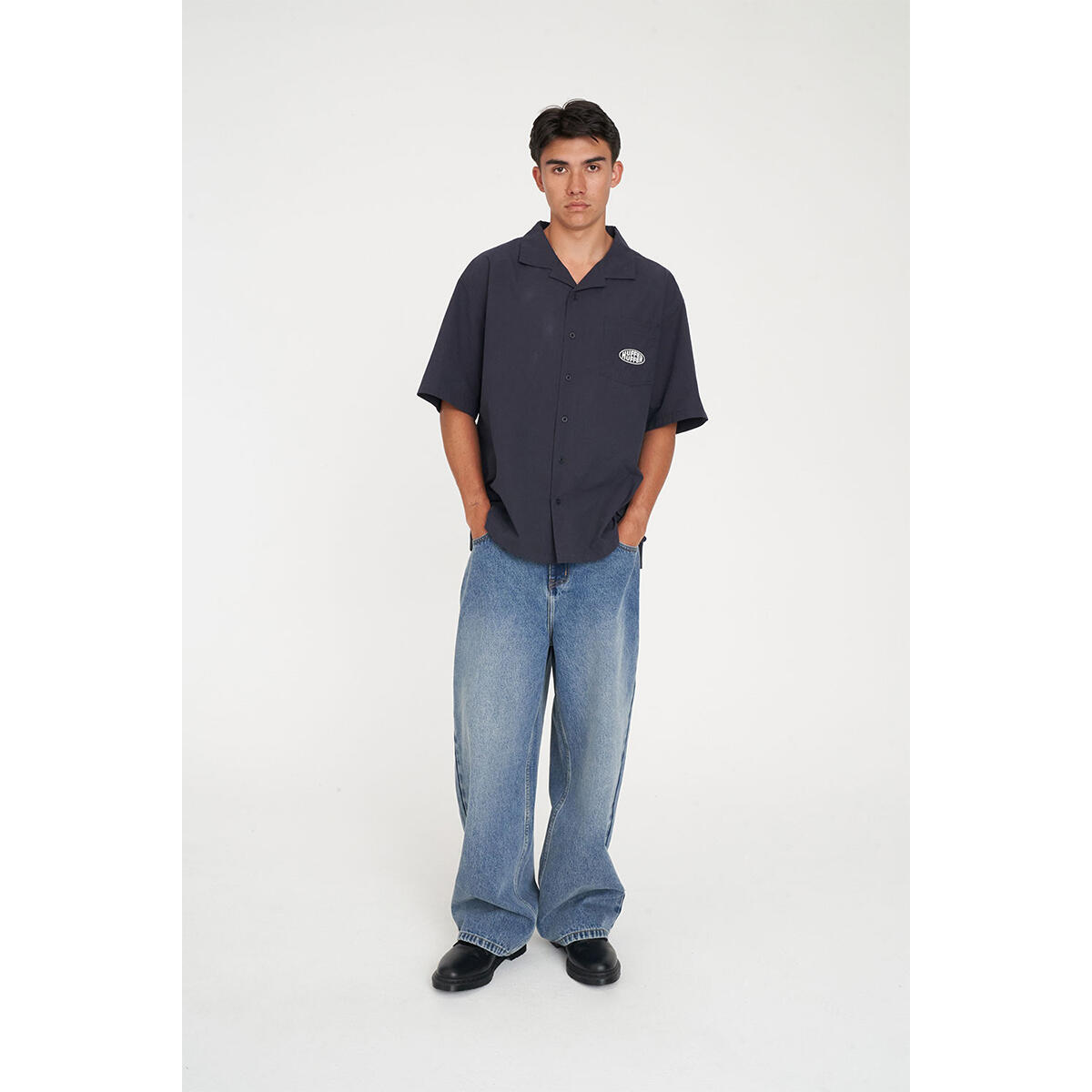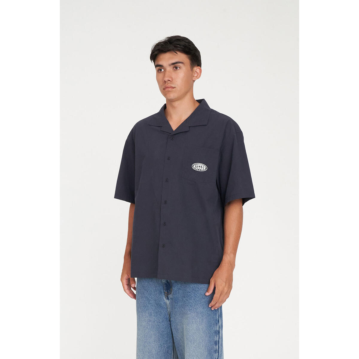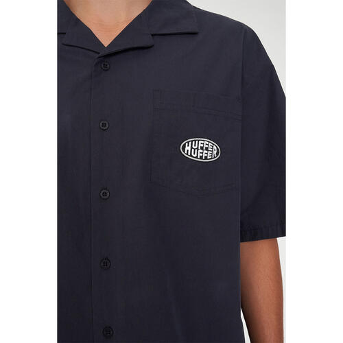 • What you need to know: 100% Cotton, 130gsm, Short sleeve, Relaxed fit, Camp collar, Huffer branded buttons, Huffer embroidery