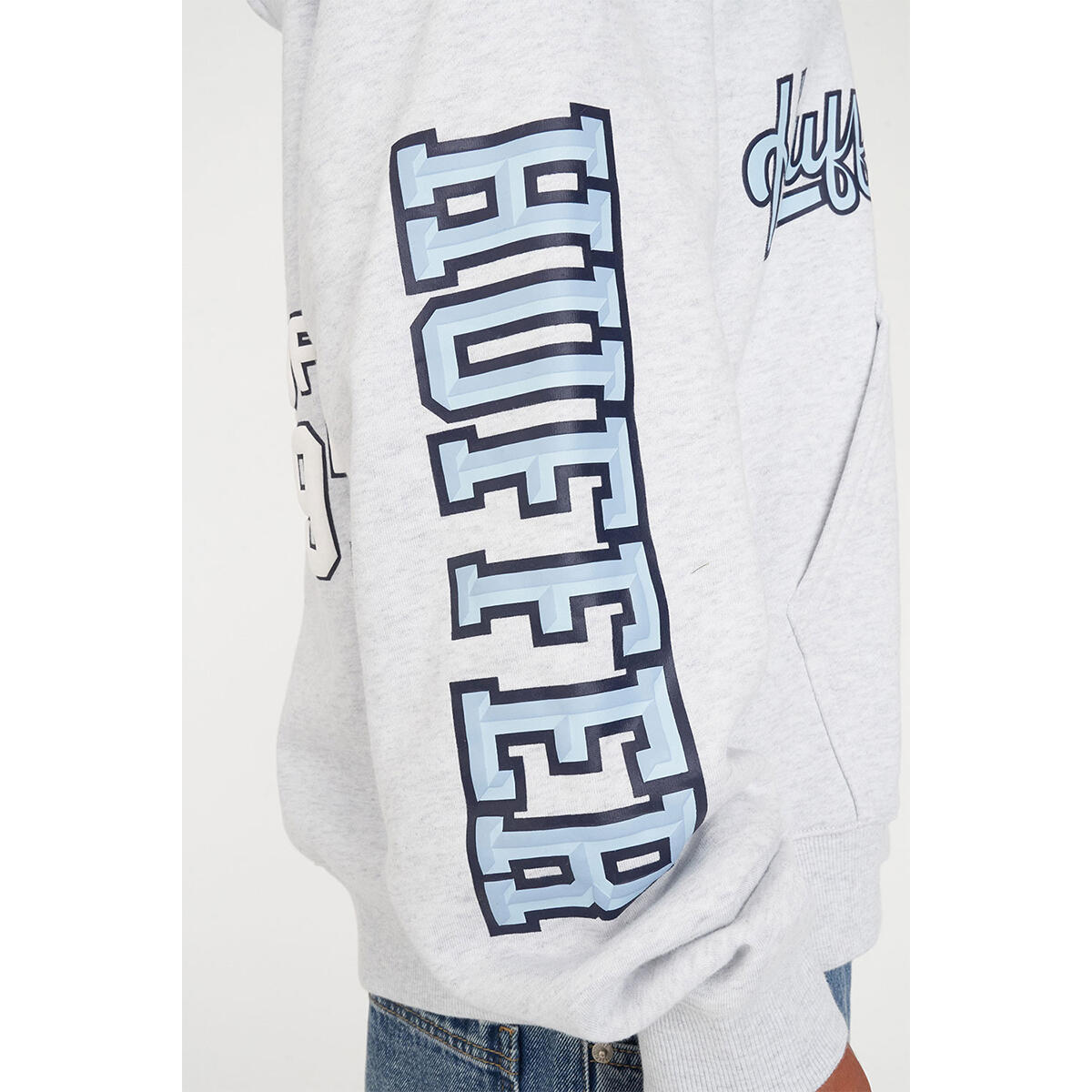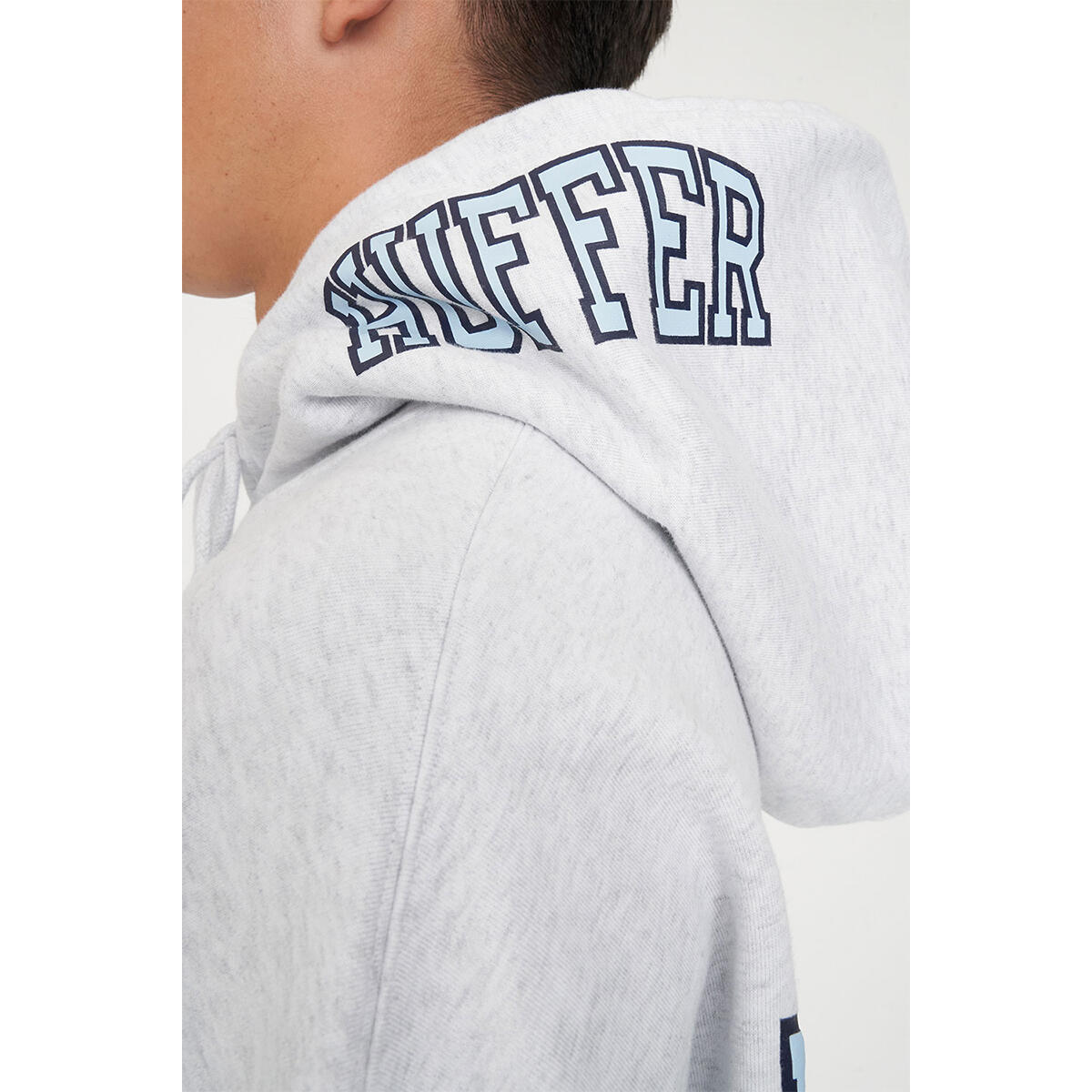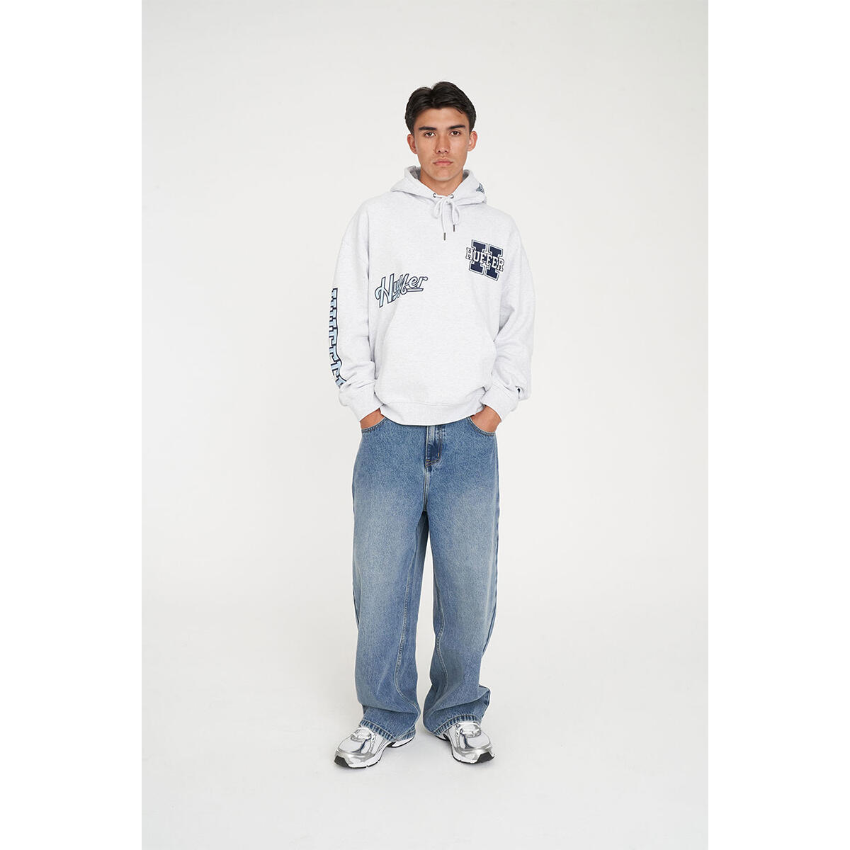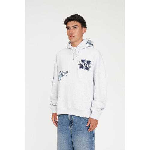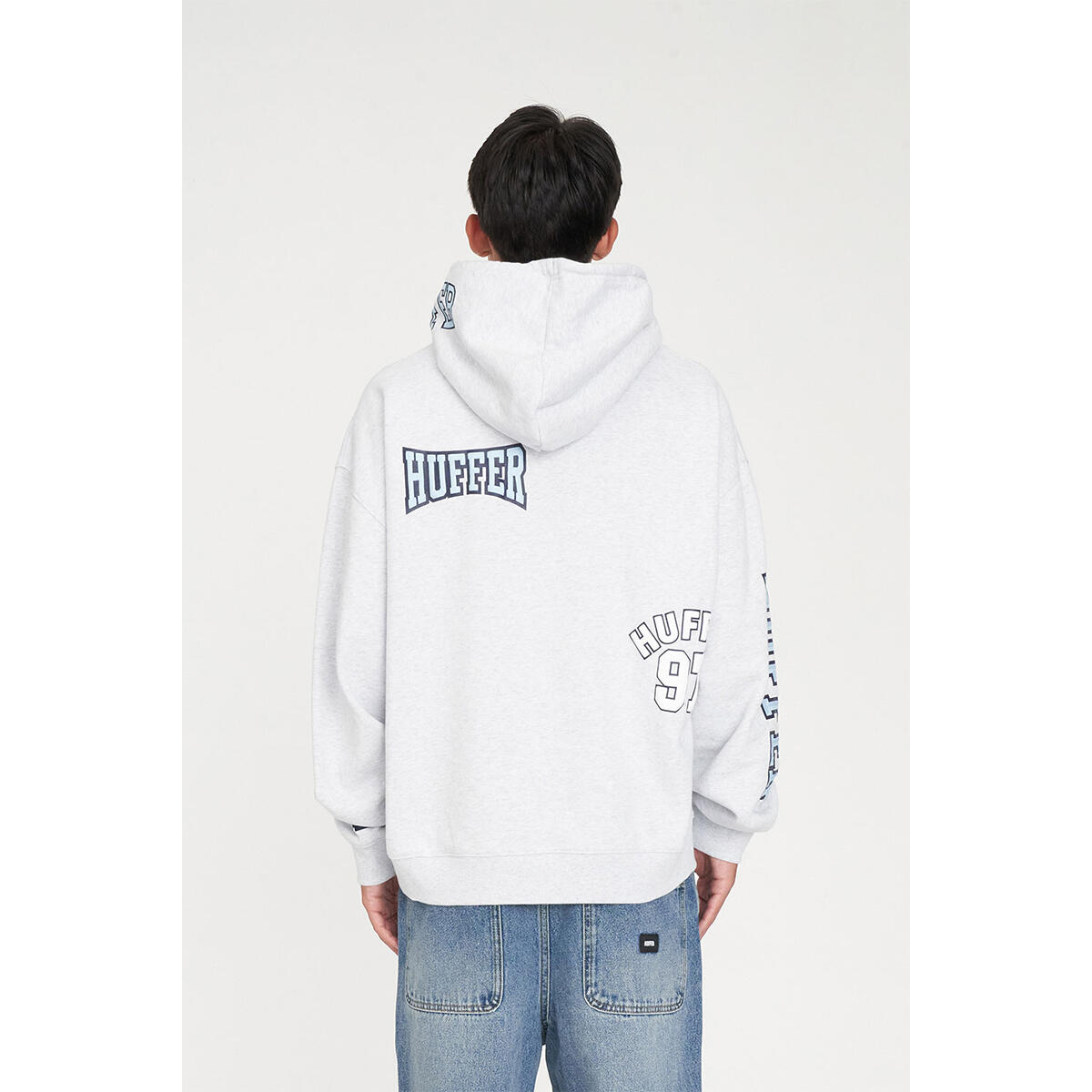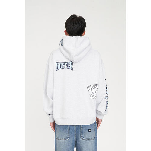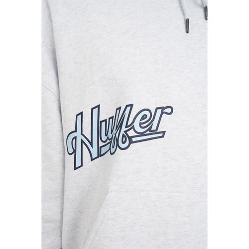 • What you need to know: 100% Cotton, 350gsm, Mid-weight brushback fleece, Custom Huffer colour, Boxy fit, Kangaroo pocket, Huffer branded hardware, Huffer branded placement embroidery, screenprint & puff print