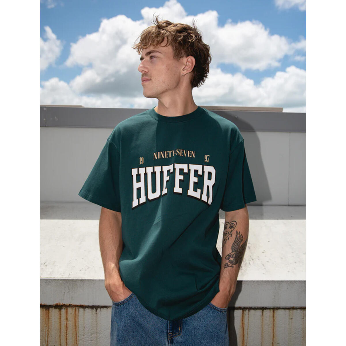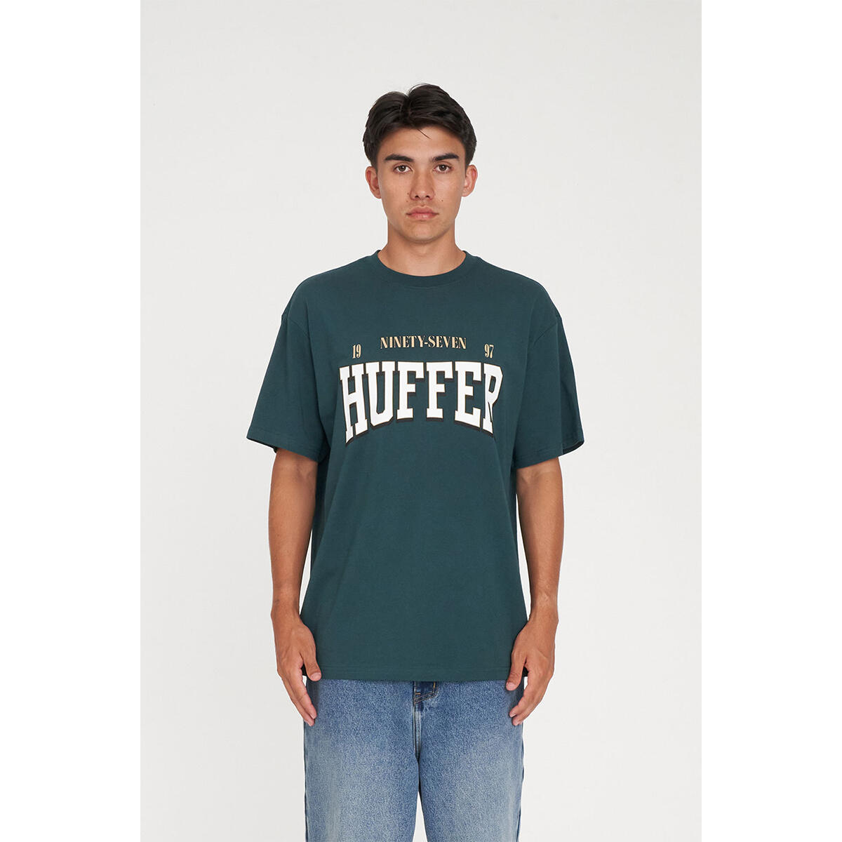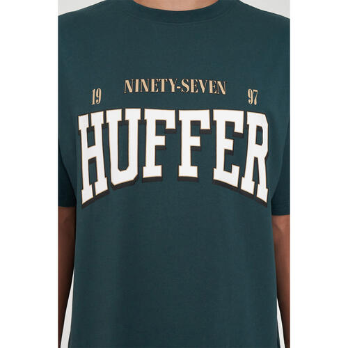 • What you need to know: 100% Cotton, 190gsm, 20mm Neck rib, Standard weight jersey, Classic fit, Short sleeve, Huffer branded placement screenprint & puff print