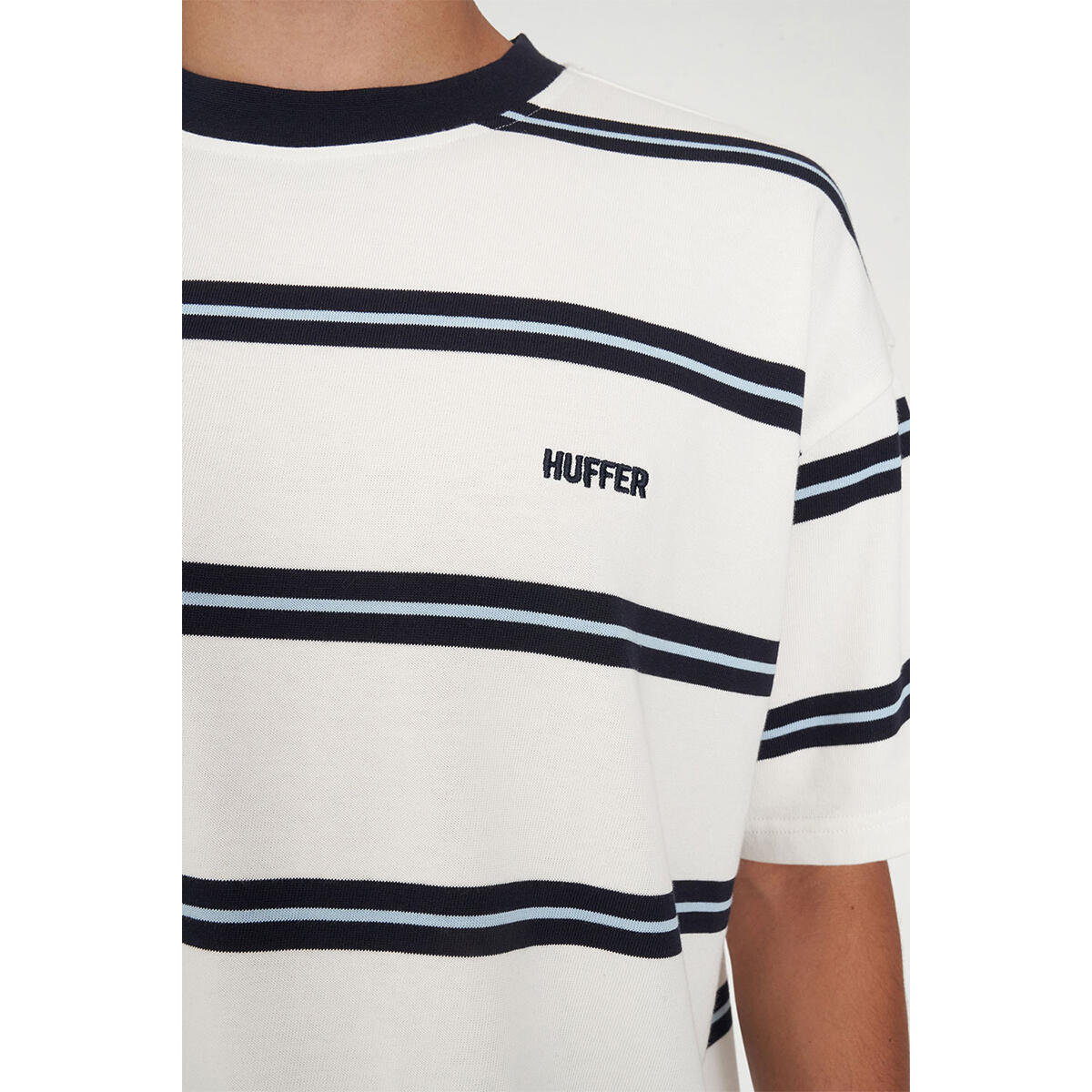 • What you need to know: 100% Cotton, 280gsm, Rugby knit, 25mm Neck rib, Custom Huffer yarn dyed stripe, Boxy fit, Short sleeve, Huffer branded placement embroidery