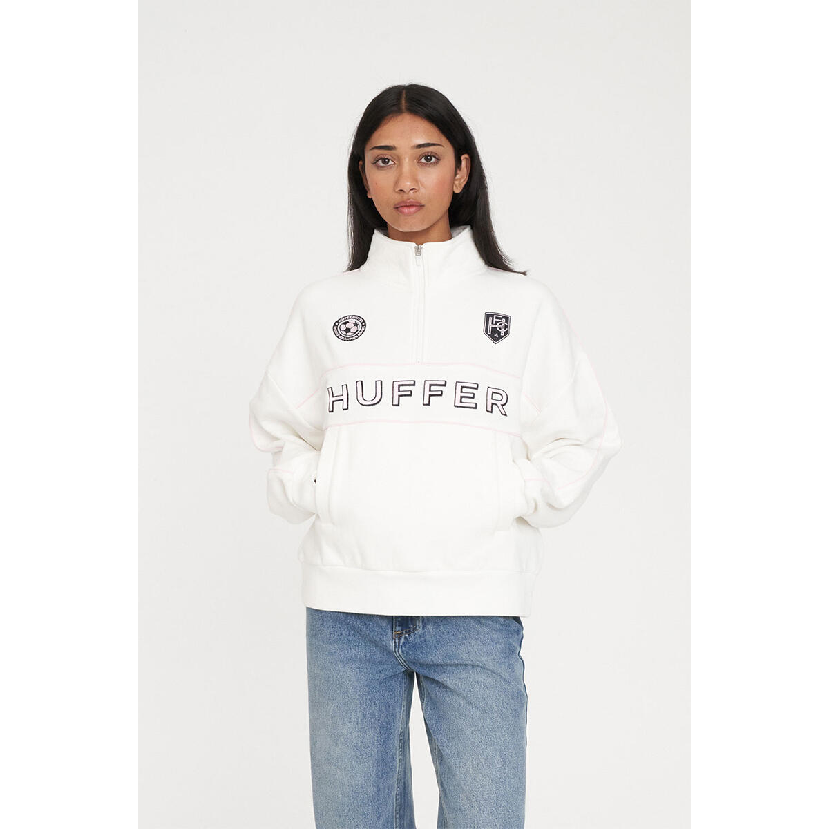 • What you need to know: 100% Cotton, 350gsm, Mid-weight brushback fleece, Custom Huffer piece dyed colour, High neck with zip opening, Boxy streetwear fit, Huffer branded placement screenprint