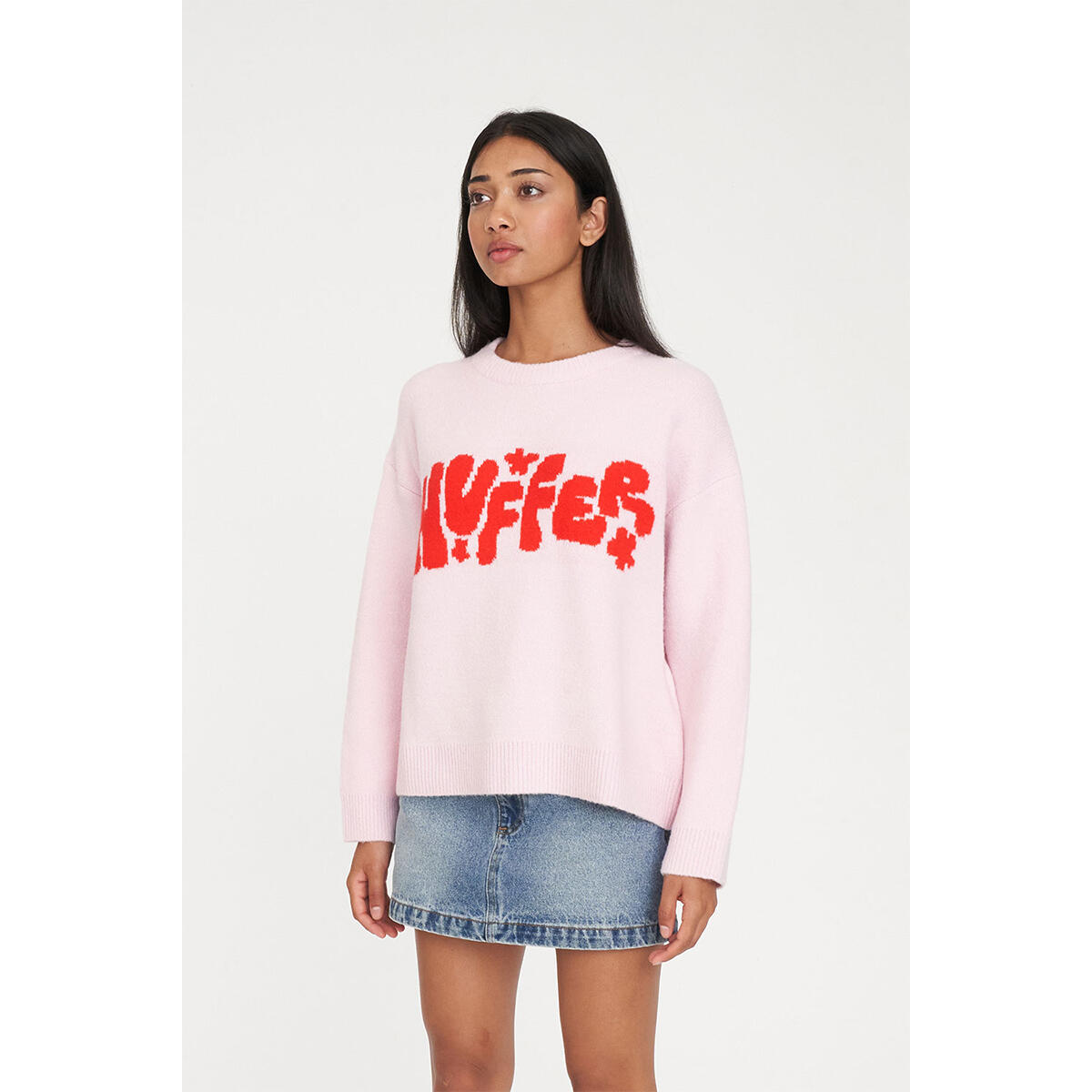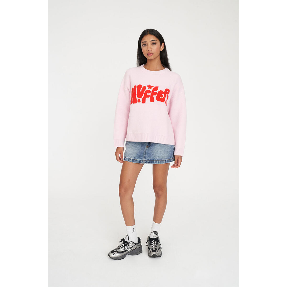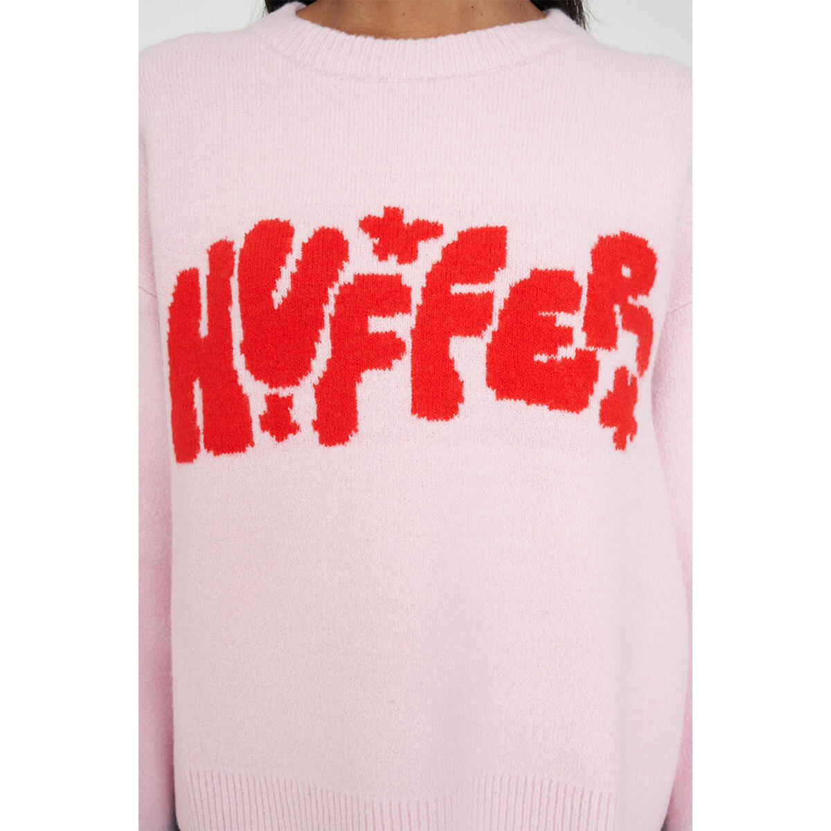 • What you need to know: 68% Acrylic 21% Nylon 8% Wool 3% Spandex, Fully fashion knit construction, Relaxed fit, Crew neck, Straight sleeve, Huffer intarsia branding, Huffer branded gold metal plate