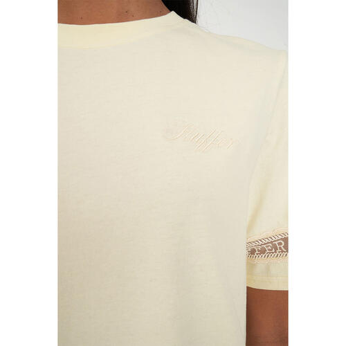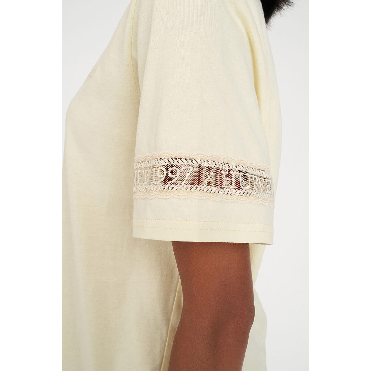 • What you need to know: 100% Cotton, 170gsm, 15mm Neck rib, Lightweight jersey, Custom Huffer piece dyed colour, Classic fit, Short sleeve, Custom Huffer embroidered lace & embroidery