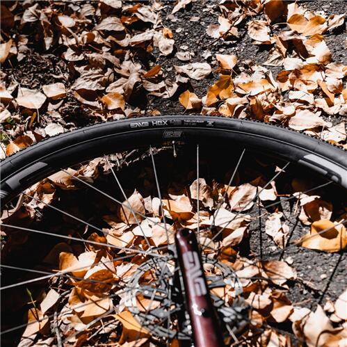 The HEX gravel tyre combines the elements required for those seeking a performance option that doesn’t sacrifice traction. A novel tread design features hexagonal blocks that allow a three-way flex pattern to add suppleness to the casing, allowing the tyre to conform to varied surface conditions for consistent handling. This provides both driving and braking traction for confident handling.