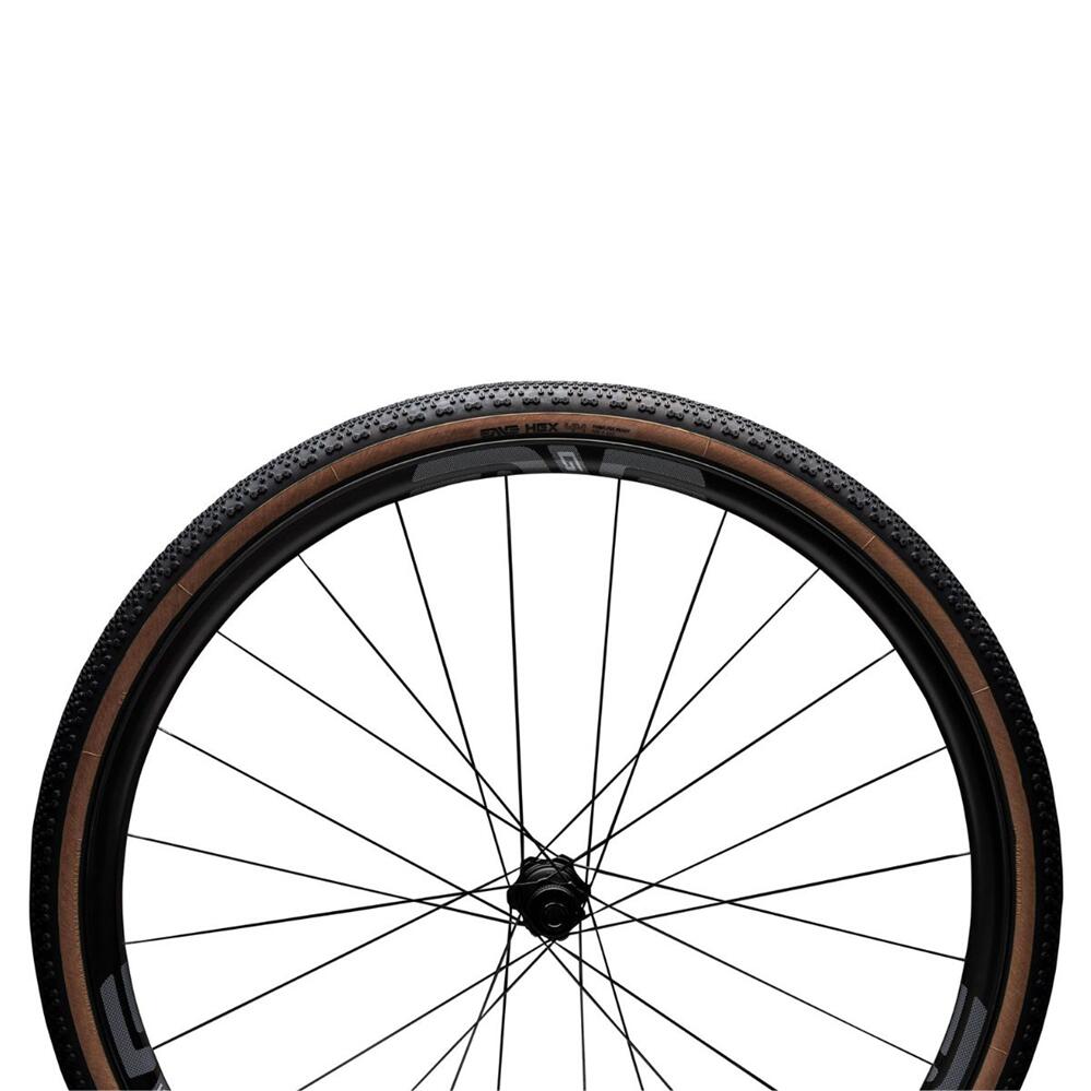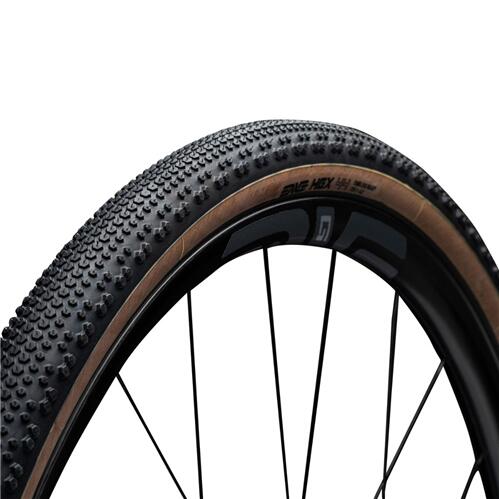 The HEX gravel tyre combines the elements required for those seeking a performance option that doesn’t sacrifice traction. A novel tread design features hexagonal blocks that allow a three-way flex pattern to add suppleness to the casing, allowing the tyre to conform to varied surface conditions for consistent handling. This provides both driving and braking traction for confident handling.