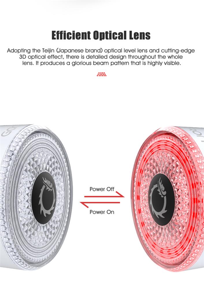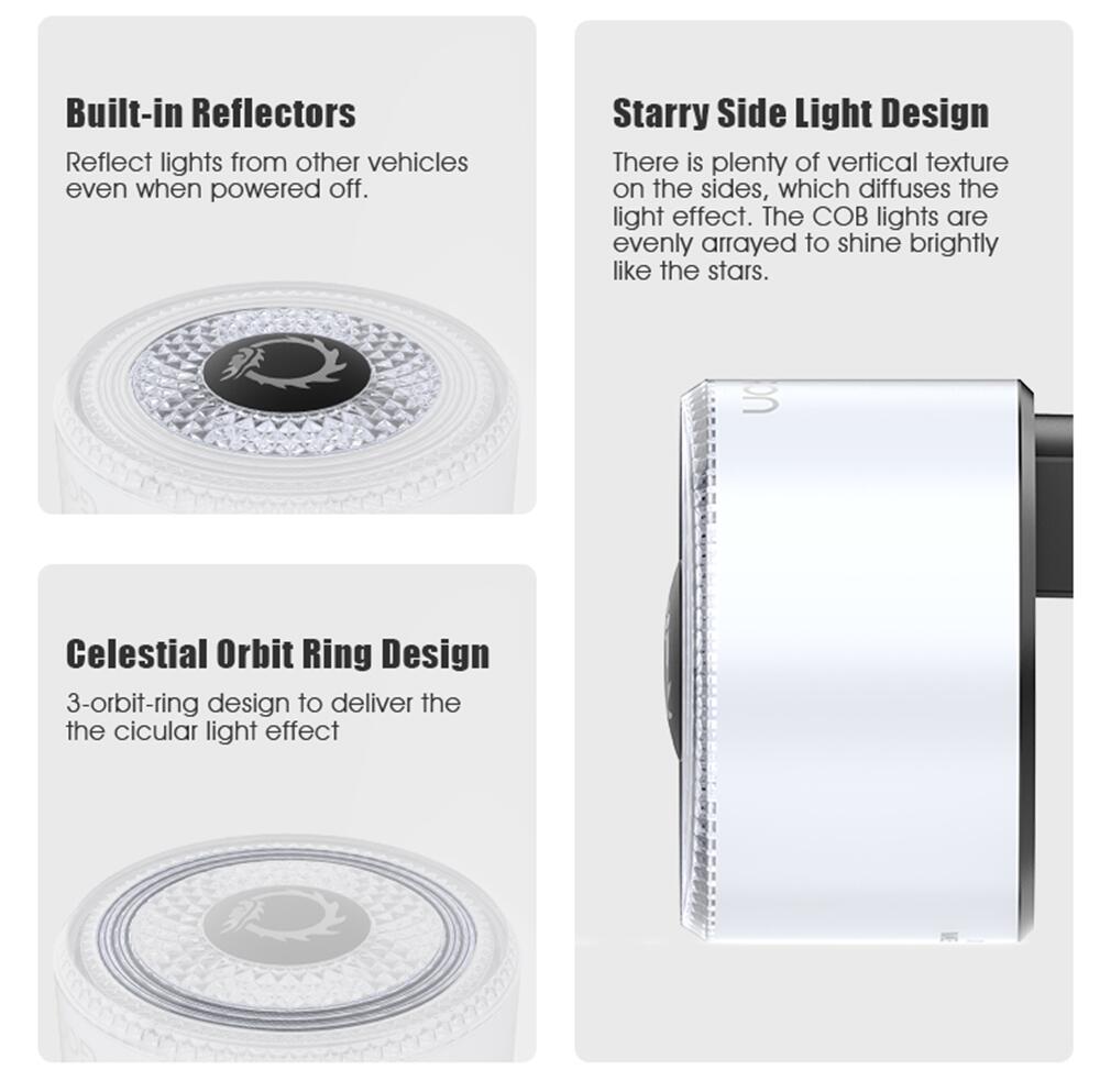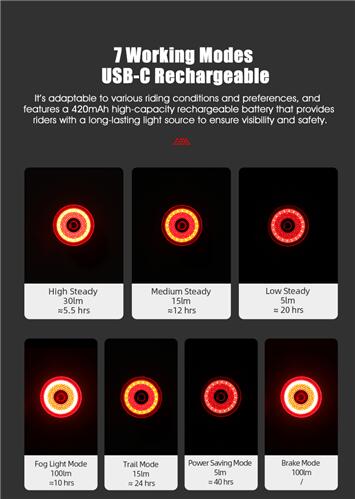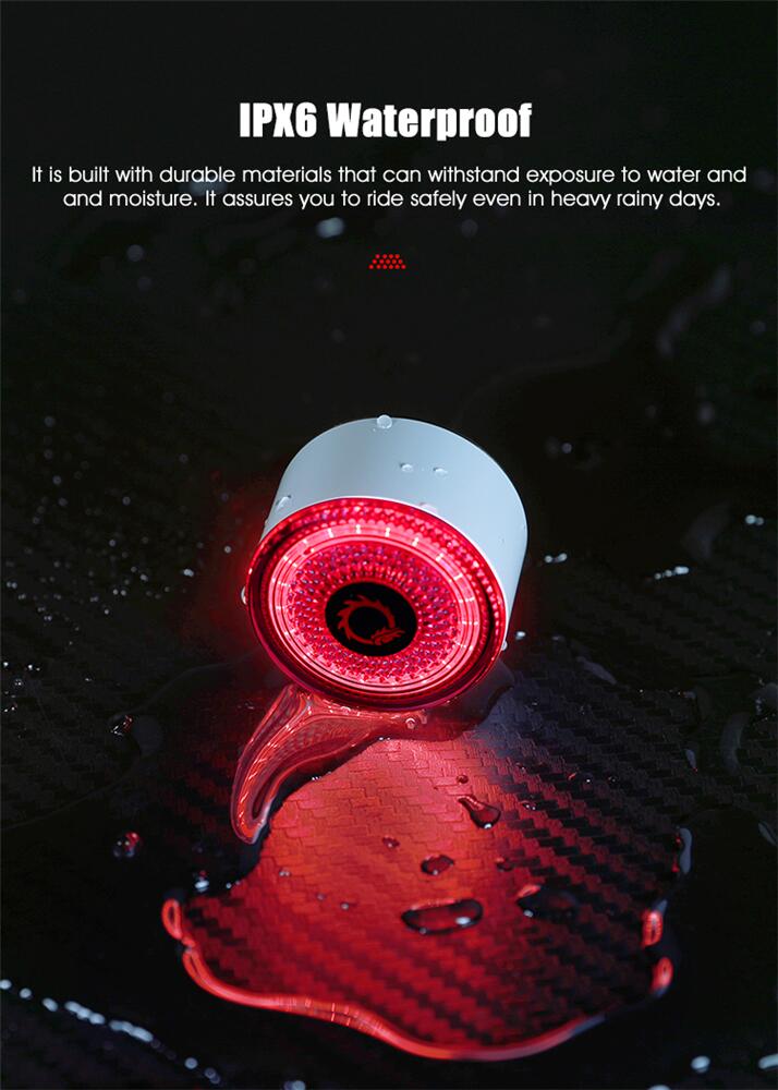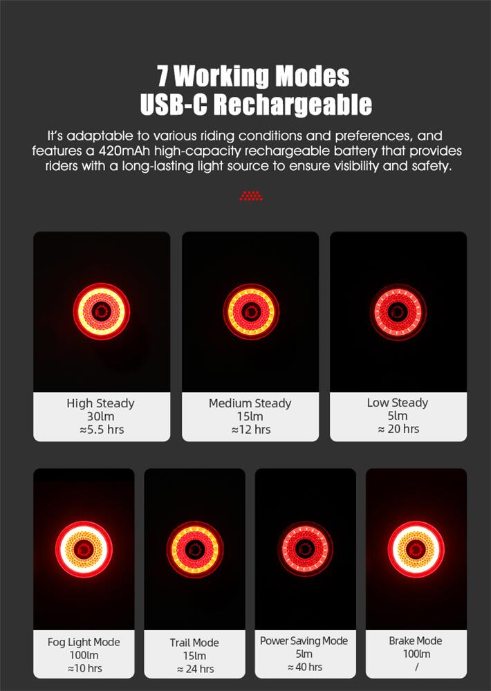 - Smart brake sensor — automatically activates 100lm on braking detection