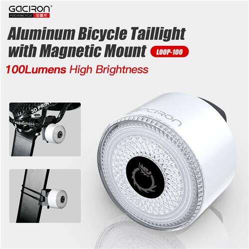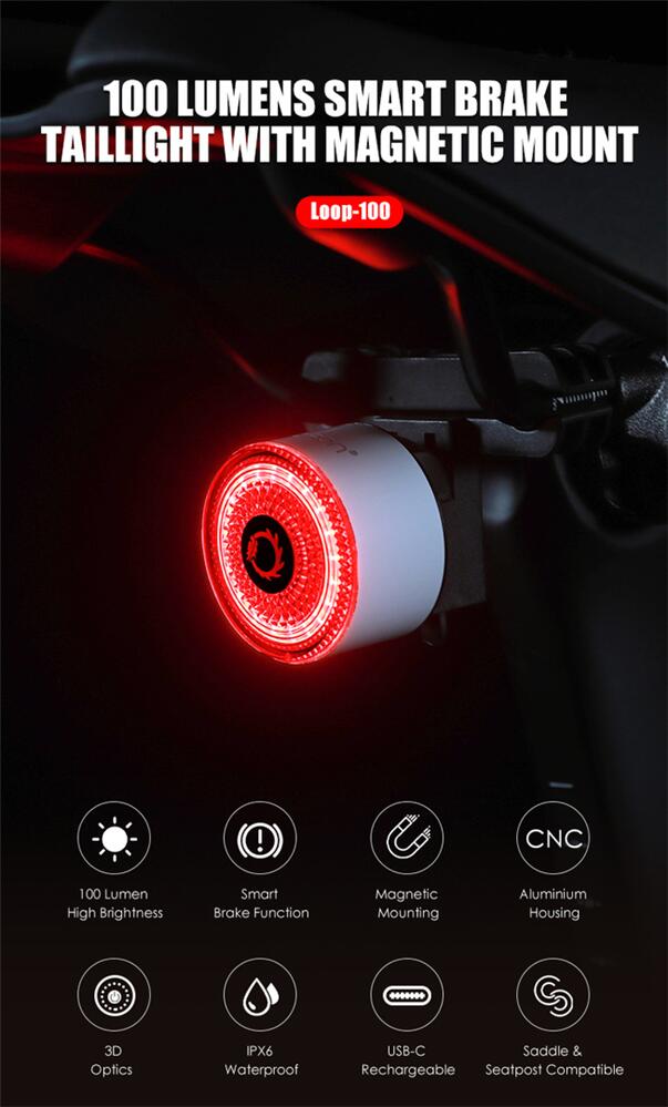 The LOOP-100 is a compact, feature-packed taillight built around a precision CNC aluminium housing that weighs just 25g. The smart brake sensor automatically boosts brightness to 100 lumens when braking is detected, then drops back to the previous mode — working across all seven light modes. A vibration sensor puts the light to sleep after 120 seconds of inactivity and wakes it when motion resumes, helping stretch the battery to up to 40 hours runtime.