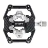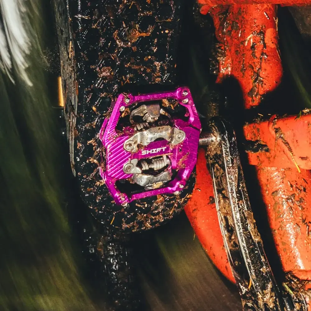 No other SPD-compatible pedals have a platform as large as SHIFT at 1201 mm². This platform contacts and locks in your shoe for confidence in extreme terrain at high speeds. SHIFT Gravity Clipless Pedals are simultaneously lighter (410g) and thinner (15mm) than all other gravity mountain bike pedals with an exceptionally low stack height. The thin profile means better cornering clearance and a lower center of gravity on the bike, while the open center between the binding cages increases mud shedding ability.