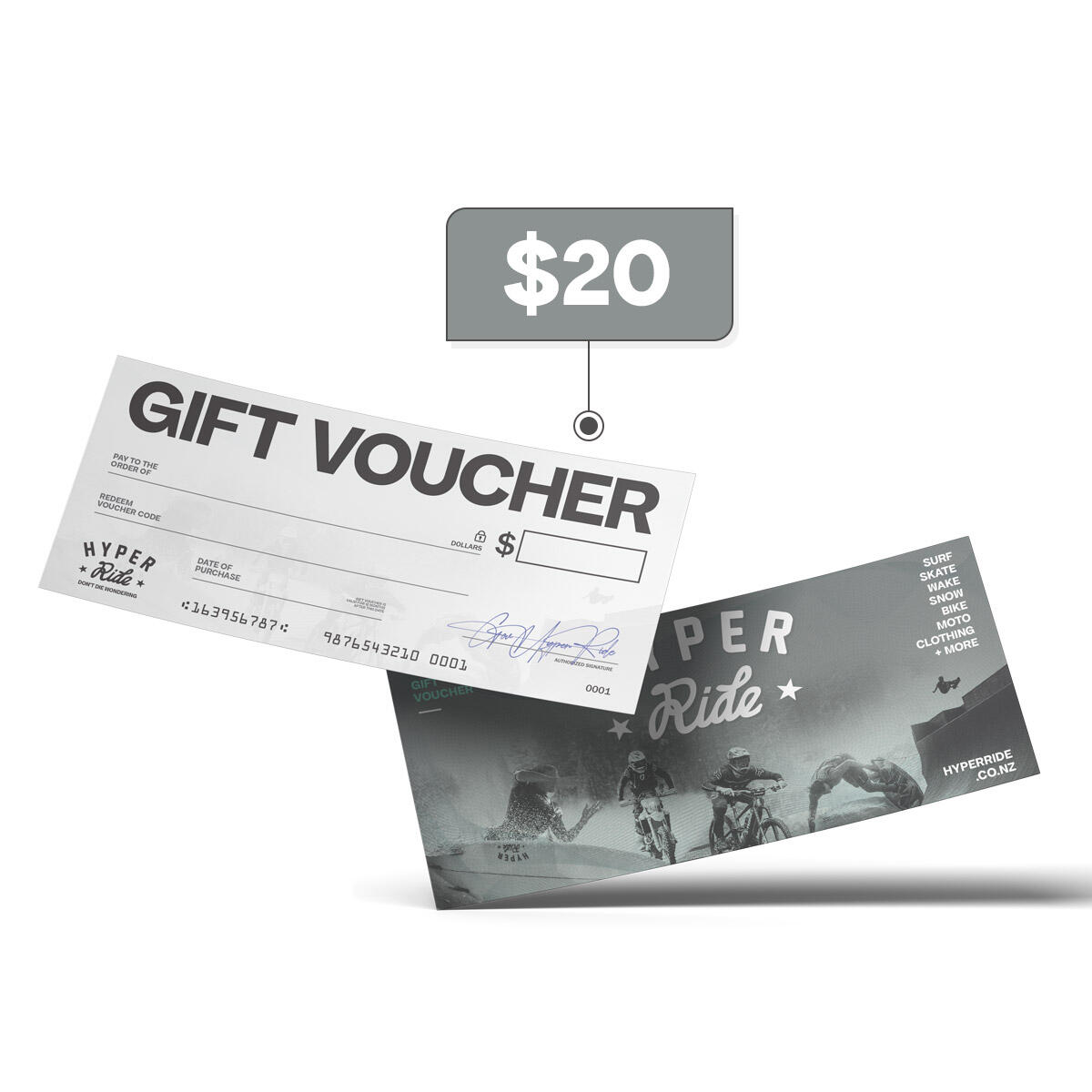 ALL GIFT VOUCHERS WILL BE SENT VIA COURIER. IF YOU WOULD LIKE YOUR VOUCHER EMAILED THROUGH TO YOU, PLEASE EMAIL US AT ridesupport@hyperride.co.nz AND WE CAN REFUND YOUR $9.99 SHIPPING COST